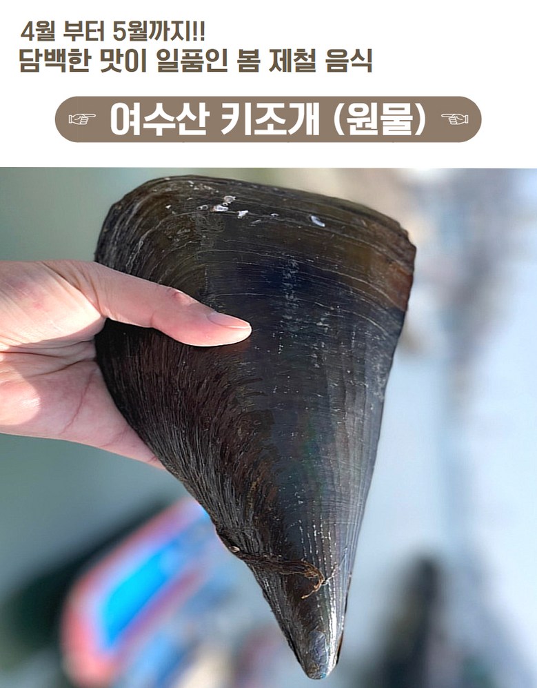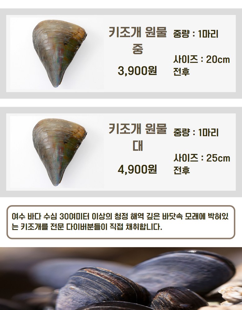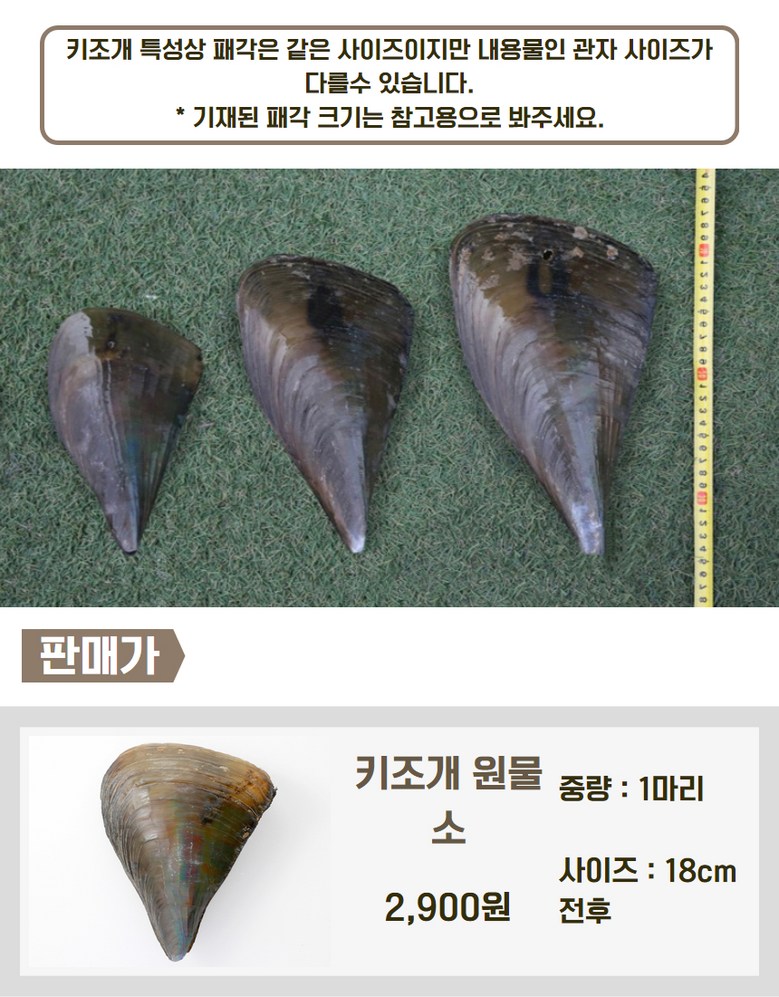 | 품목 또는 명칭 | 키조개 | 포장단위별 내용물의 용량(중량),수량,크기 | 포장단위별 내용물의 수량 : 1개 / 포장단위별 내용물의 크기 : 18cm 전후 |