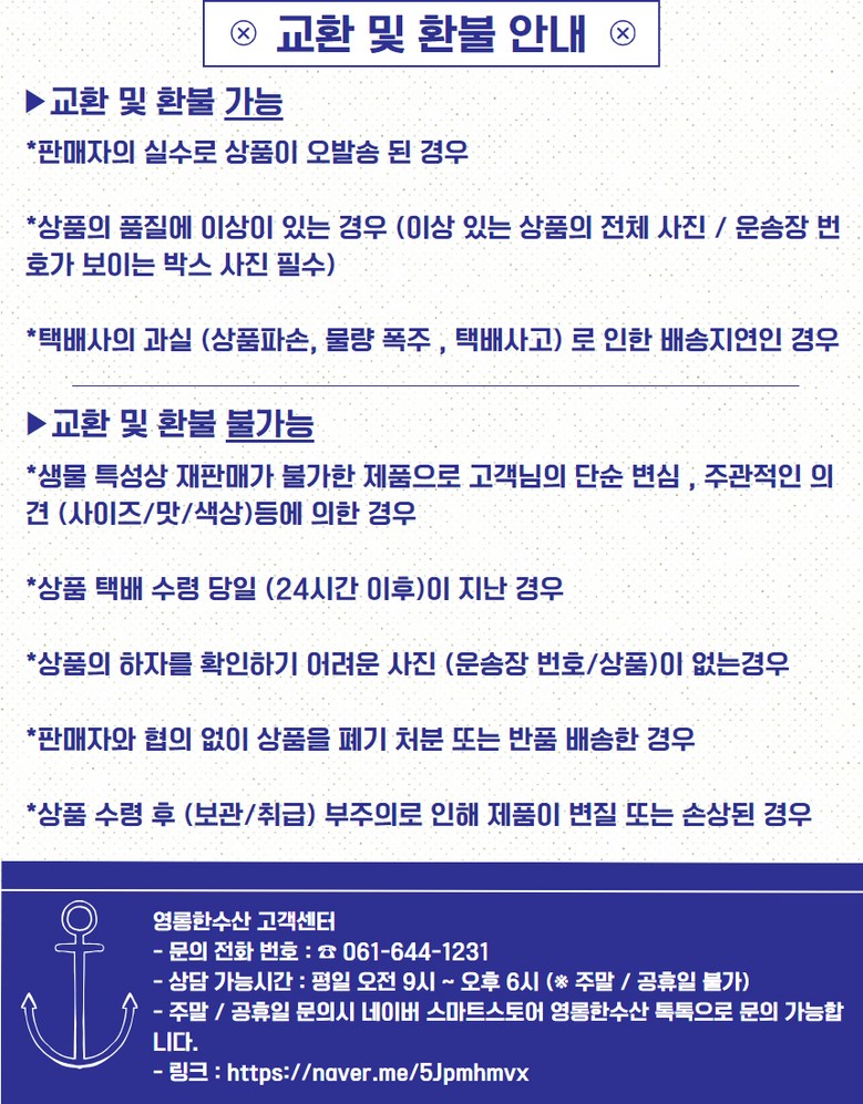 - ㆍ교환/반품에 관한 일반적인 사항은 판매자가 제시사항보다 관계법령이 우선합니다.