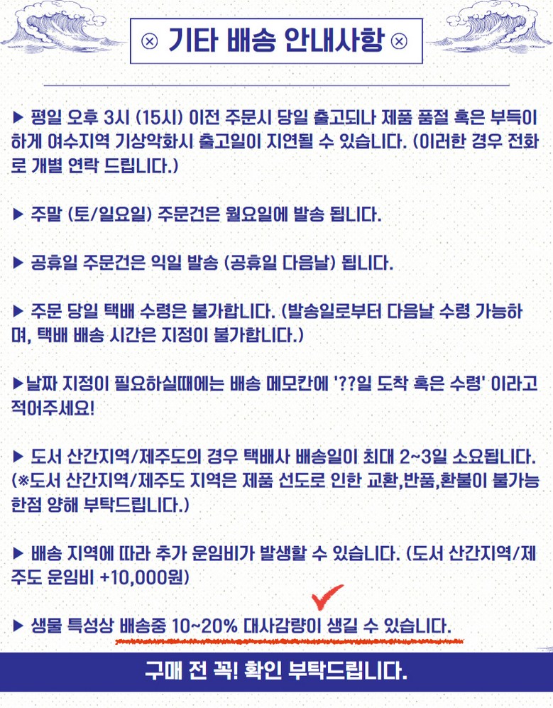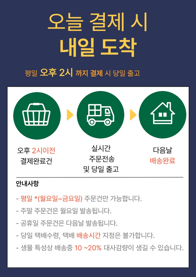 | 배송방법 | 신선/냉장/냉동 | 배송비 | 무료배송 · 도서산간 추가 배송비 - 제주 지역: 7,000원 - 도서산간 지역: 7,000원 |