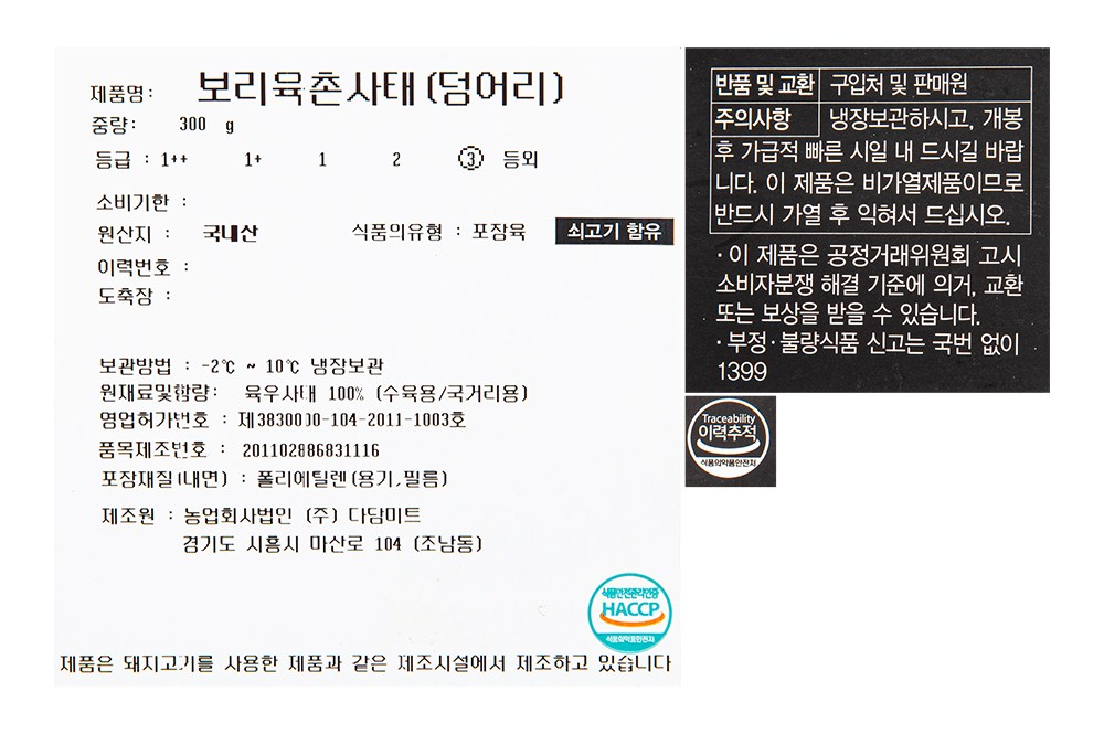 | 소비기한 또는 품질유지기한 | 소비기한(또는 유통기한) : 2026년 02월 02일 이거나 그 이후인 상품 | 세부 품목군별 표시사항 | 축산물 등급표시 : 3등급 / 이력번호 표시유무 : 이력번호 표시제품임 |