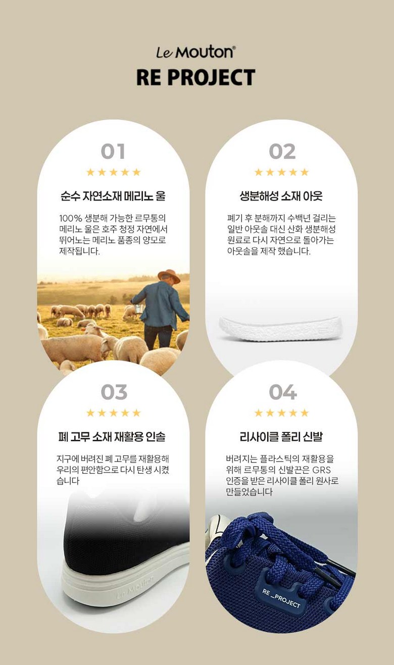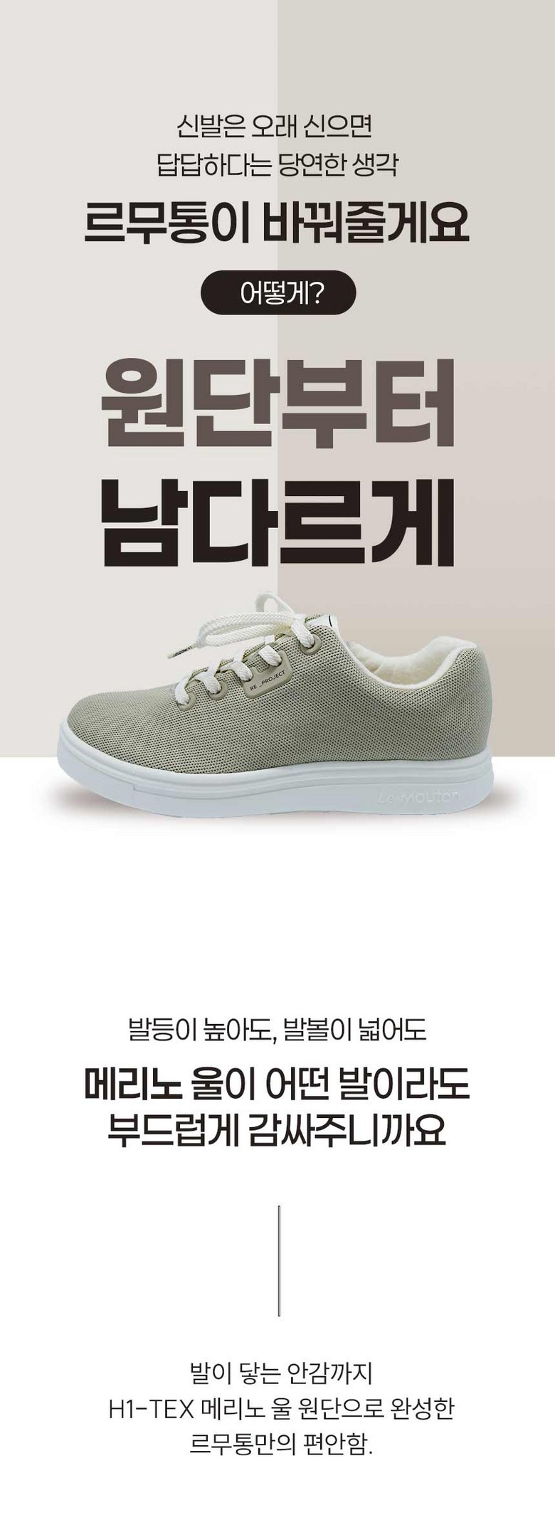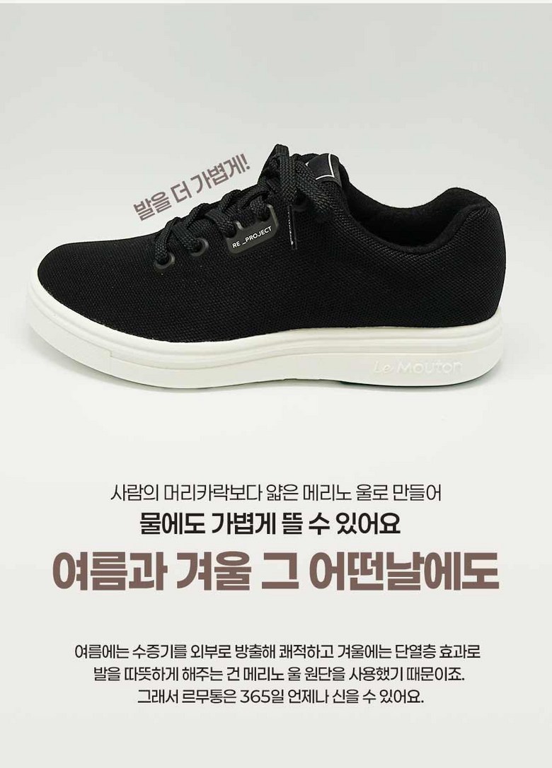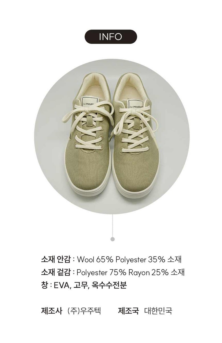 | 제품의 주소재(운동화인 경우에는 겉감,안감을 구분하여 표시) | 안감 : Wool 65% polyester 35% 겉감 : polyester 75% 레이온 25% | 색상 | 블랙,화이트,내추럴베이지,인디고네이비 |