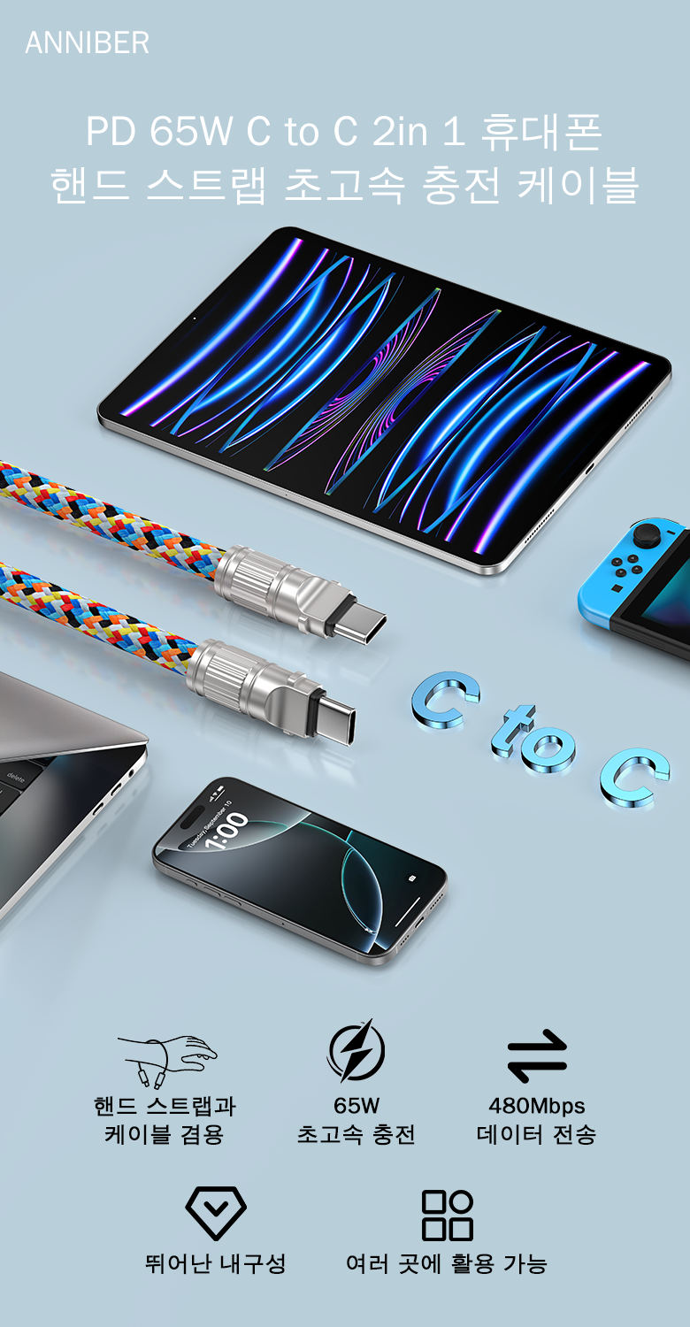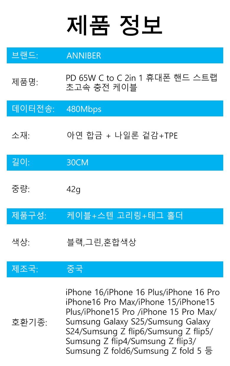 | 품명 및 모델명 | ANNIBER PD 65W C to C 2 in 1 손목 스트랩 초고속 충전 케이블 | KC 인증정보 | 해당없음 |