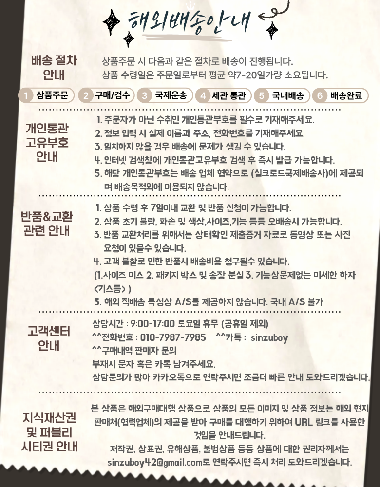 | 배송방법 | 해외직구 | 배송비 | 무료배송 - 도서산간 지역 배송불가 |