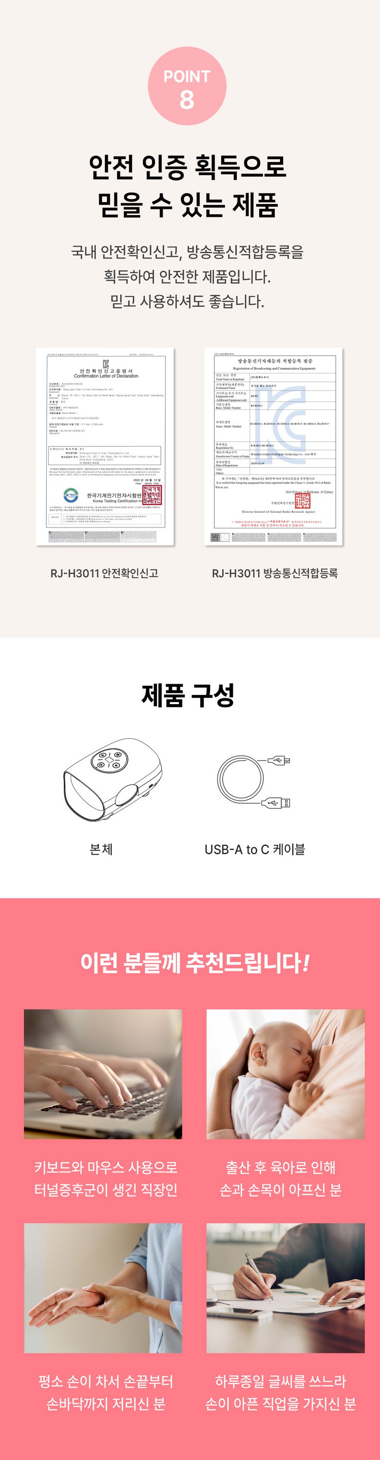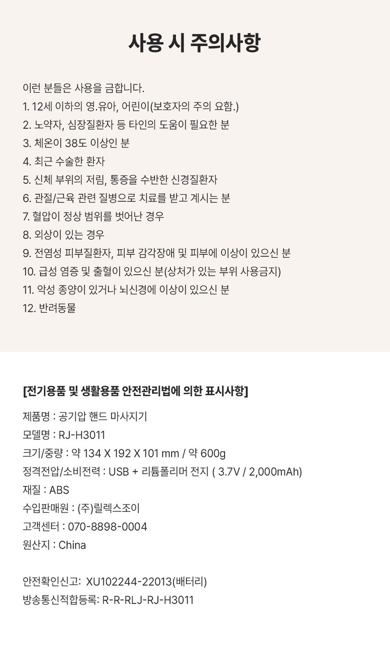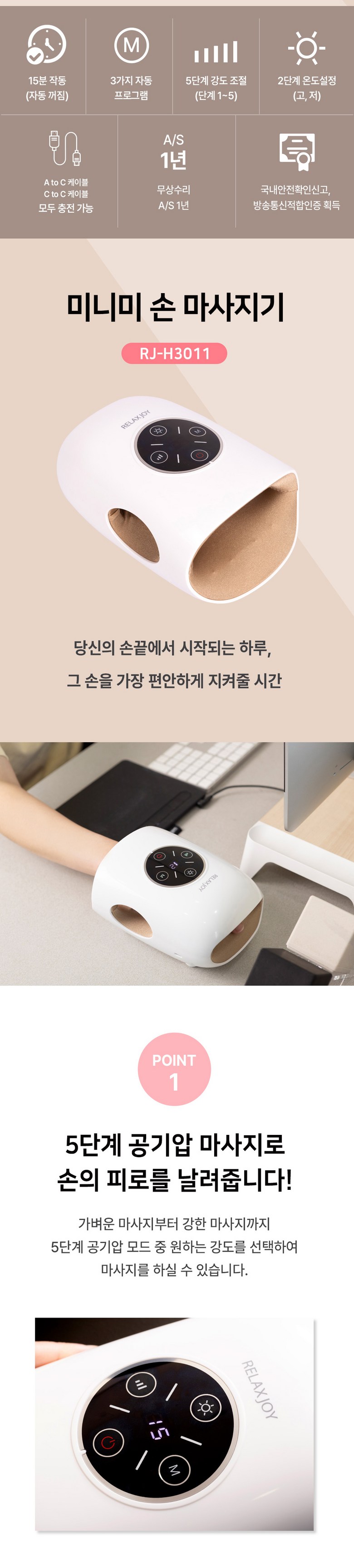 | 품명 및 모델명 | 릴렉스조이 미니미 손 마사지기 RJ-H3011 | KC 인증정보 | XU102244-22013A |