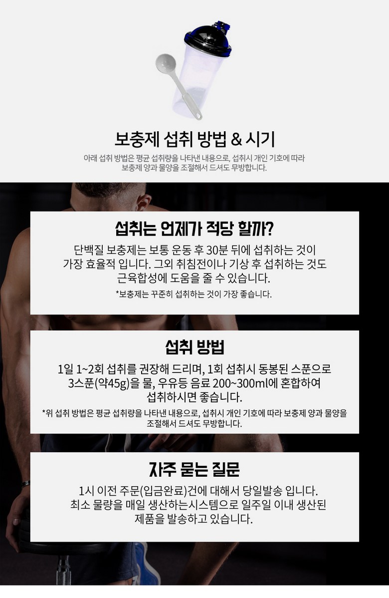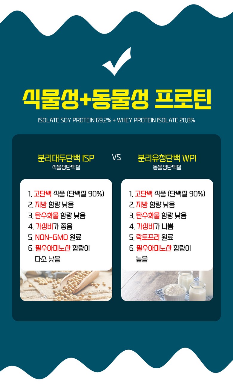 | 포장단위별 내용물의 용량(중량), 수량 | 1kg | 원재료명 및 함량 | 분리대두단백(중국산)69.2%, 분리유청단백(미국산)20.8%, 17혼합분말(국내산), 효소처리스테 비아 , 아미노산혼합분말(L-글루타민,L-이소로이신,L-로이신,L-라이신,L-메티오닌,L-페닐알라닌,L-트레오닌,L-트립토판,L-발린), 비타민/미네랄혼합분말(제2인산칼슘,비타민C비타민A,니코틴산아미드,푸마르산제일철,비타민E,판토텐산칼슘,산화아연,비타민B6염산염,비타민B1염산염,비타민B2,엽산) |