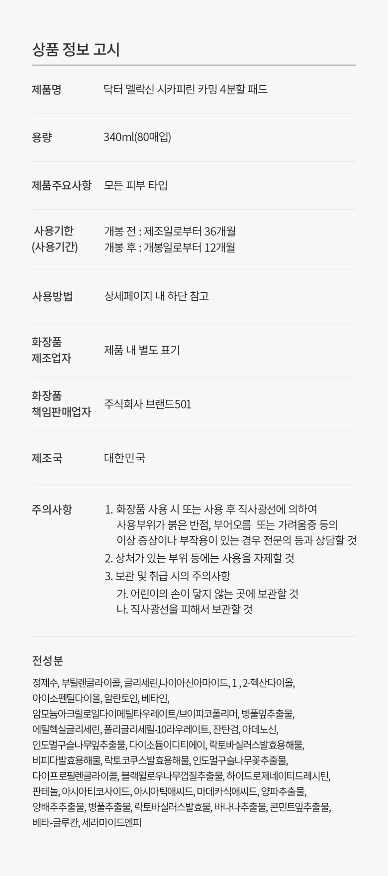 | 화장품제조업자, 화장품책임판매업자 및 맞춤형화장품판매업자 | 상품 상세페이지 참조 | 제조국 | 상품 상세페이지 참조 |