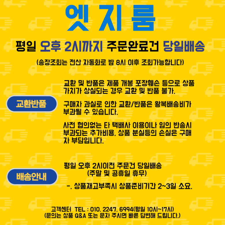 - ㆍ모니터 해상도의 차이로 인해 색상이나 이미지가 실제와 달라, 고객이 단순 변심으로 교환/반품을 무료로 요청하는 경우