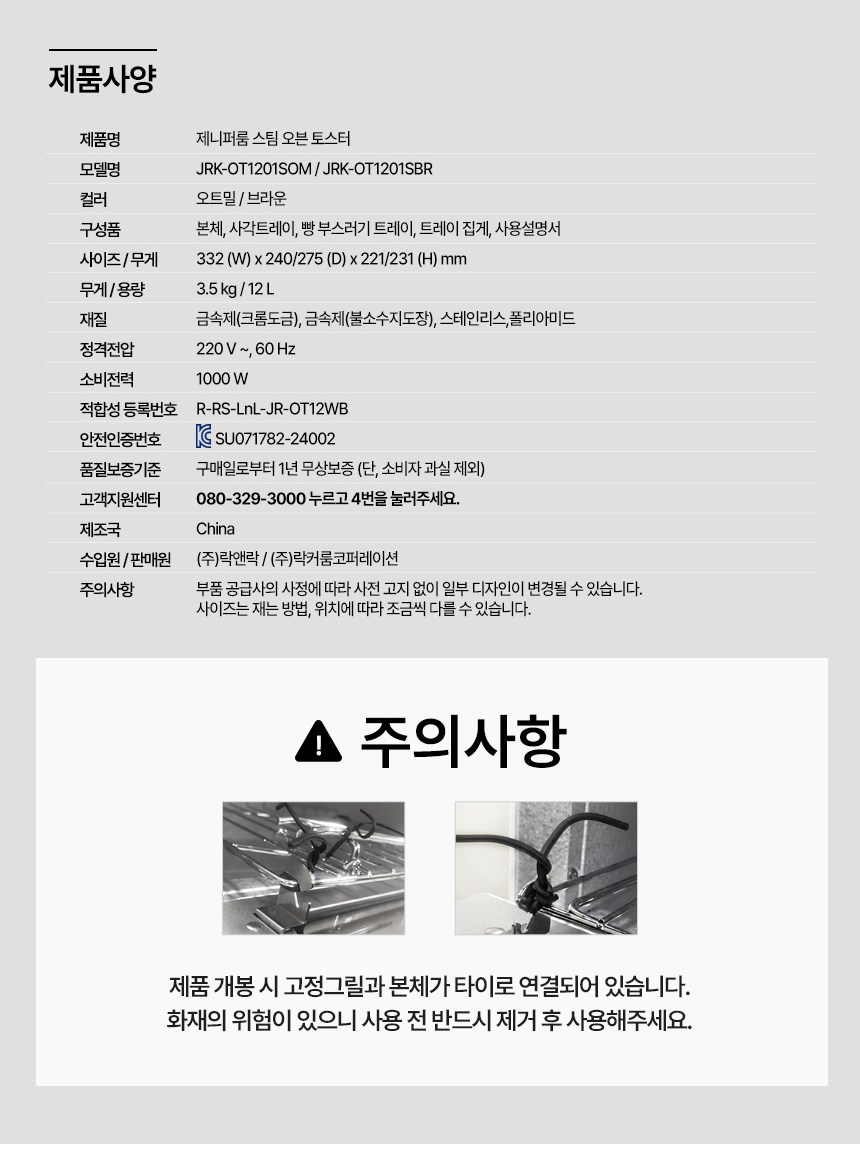 품명 및 모델명 | 전기 오븐기기 / JRK-OT1201SOM | KC 인증정보 | SU071782-24002 / R-RS-LnL-JR-OT12WB |