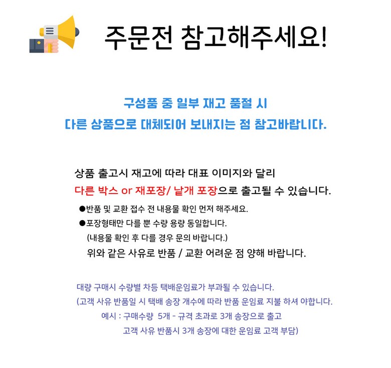 - ㆍ모니터 해상도의 차이로 인해 색상이나 이미지가 실제와 달라, 고객이 단순 변심으로 교환/반품을 무료로 요청하는 경우