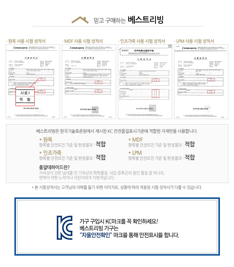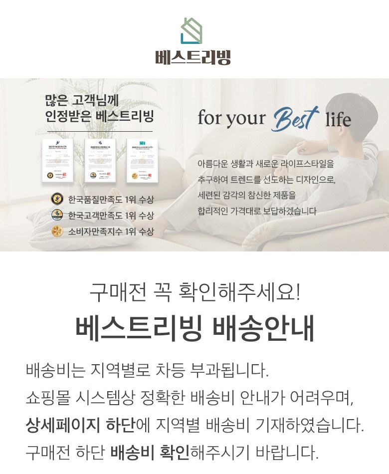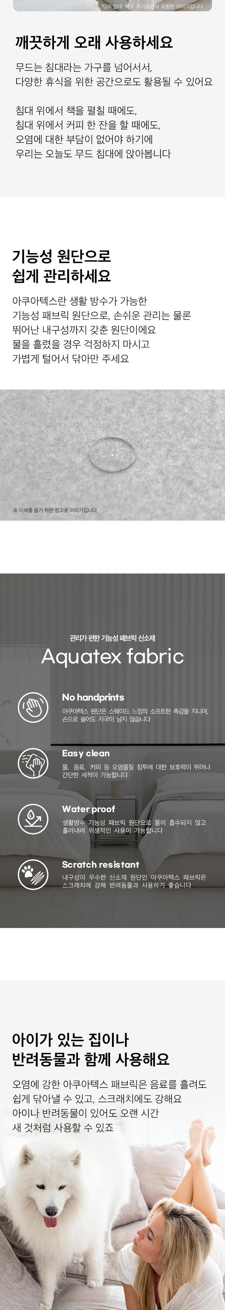 | 주요 소재 | 아쿠아텍스 기능성 패브릭(마감재), 고밀도 스펀지, 목대(원목), MDF, PB 외 | 제조자(수입자) | (주)베스트리빙 |