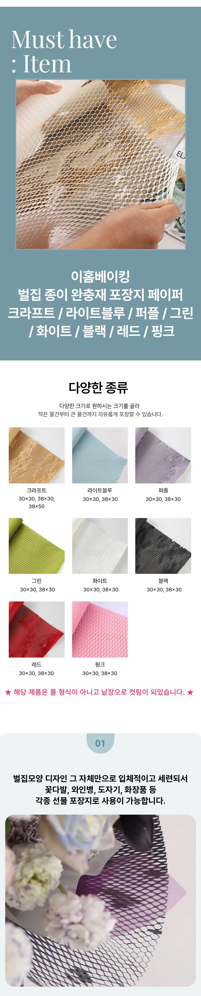 | 품명 및 모델명 | 이홈베이킹 벌집 낱장 핑크 종이 완충재 포장지 페이퍼38x30 약50매입 | 인증/허가 사항 | 해당없음 |