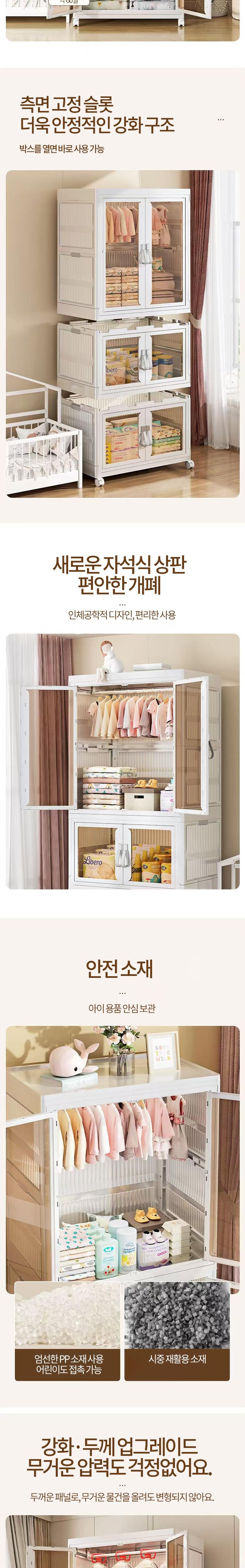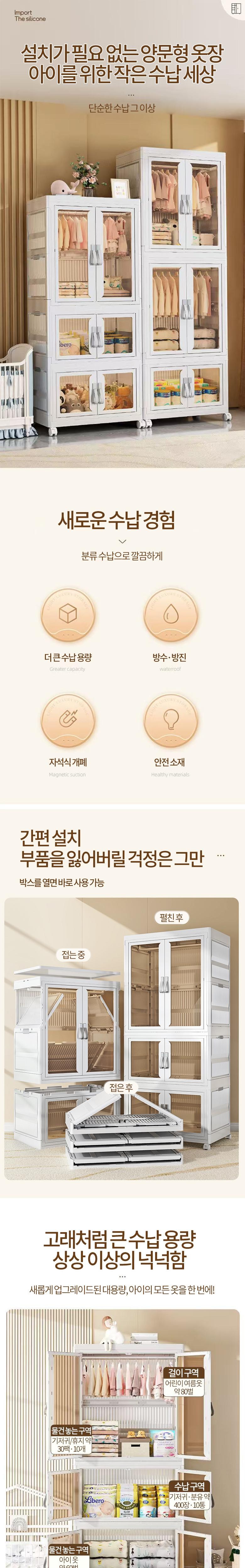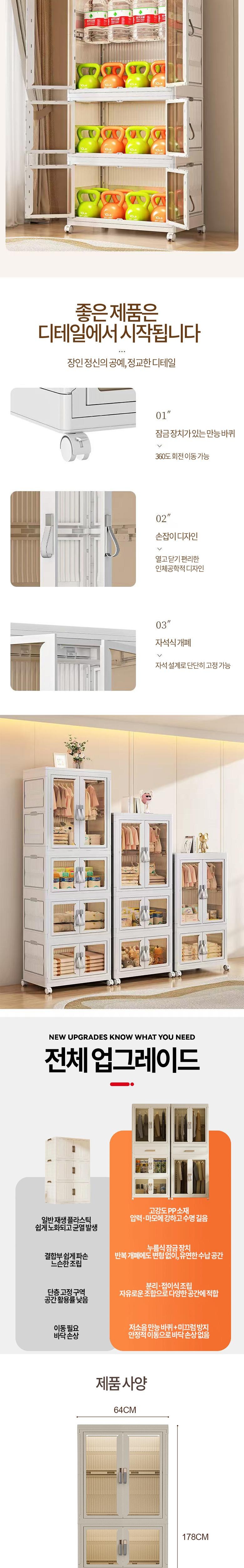 상부커버, 상하부 도어패널(내외부), 좌우 사이드도어(상하부), 베이스, 서랍하부, 뒷판(상부), 상부문틀(상하부), 투명시트(크기), 하부문틀, 상부 옷장링, 손잡이, 서랍고정버클, 행거클립, 스틸파이프, 핸들버클, 잠금버클, 금도금손잡이, 스프링, 만능휠, 휠연결버클