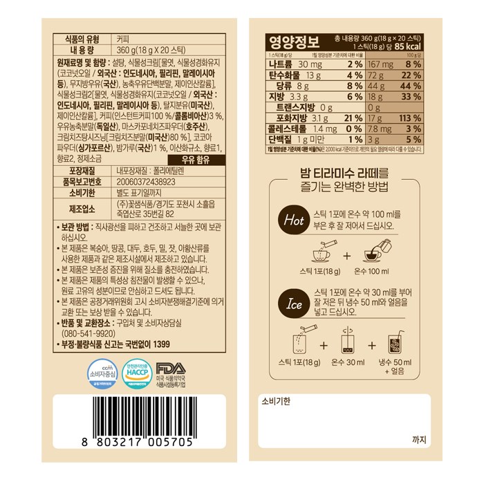 | 제품명 | 꽃샘 밤 티라미수 라떼 | 식품의 유형 | 컨텐츠 참조 |
