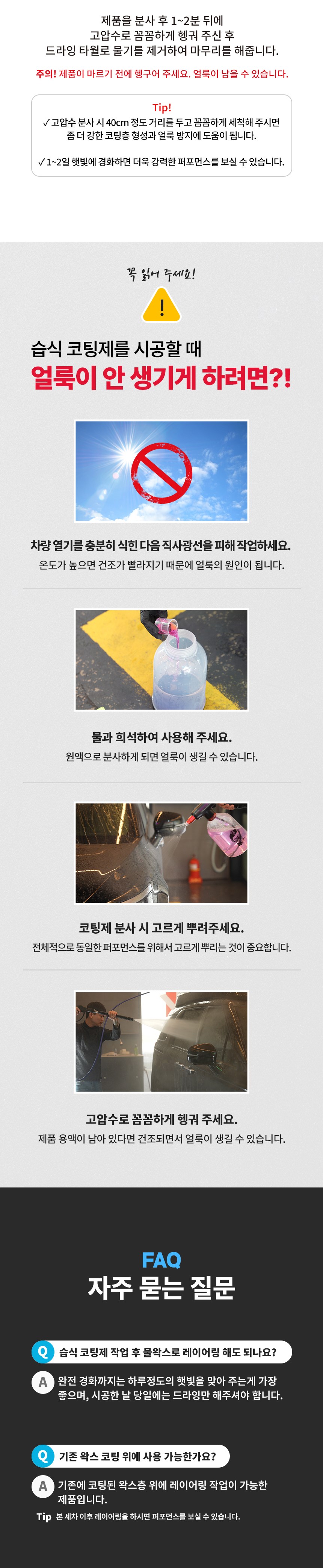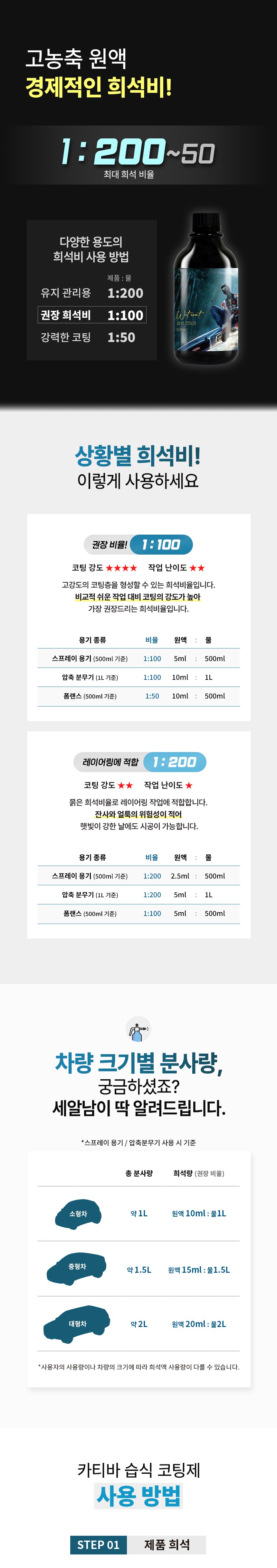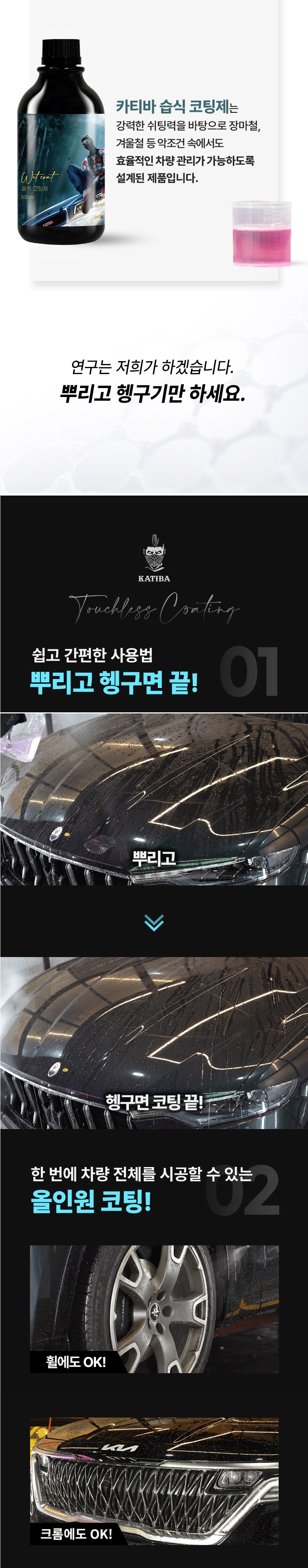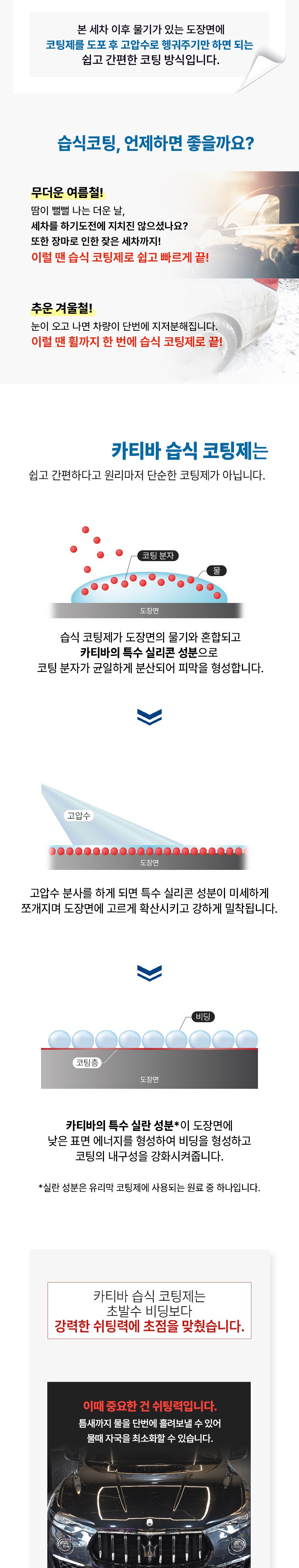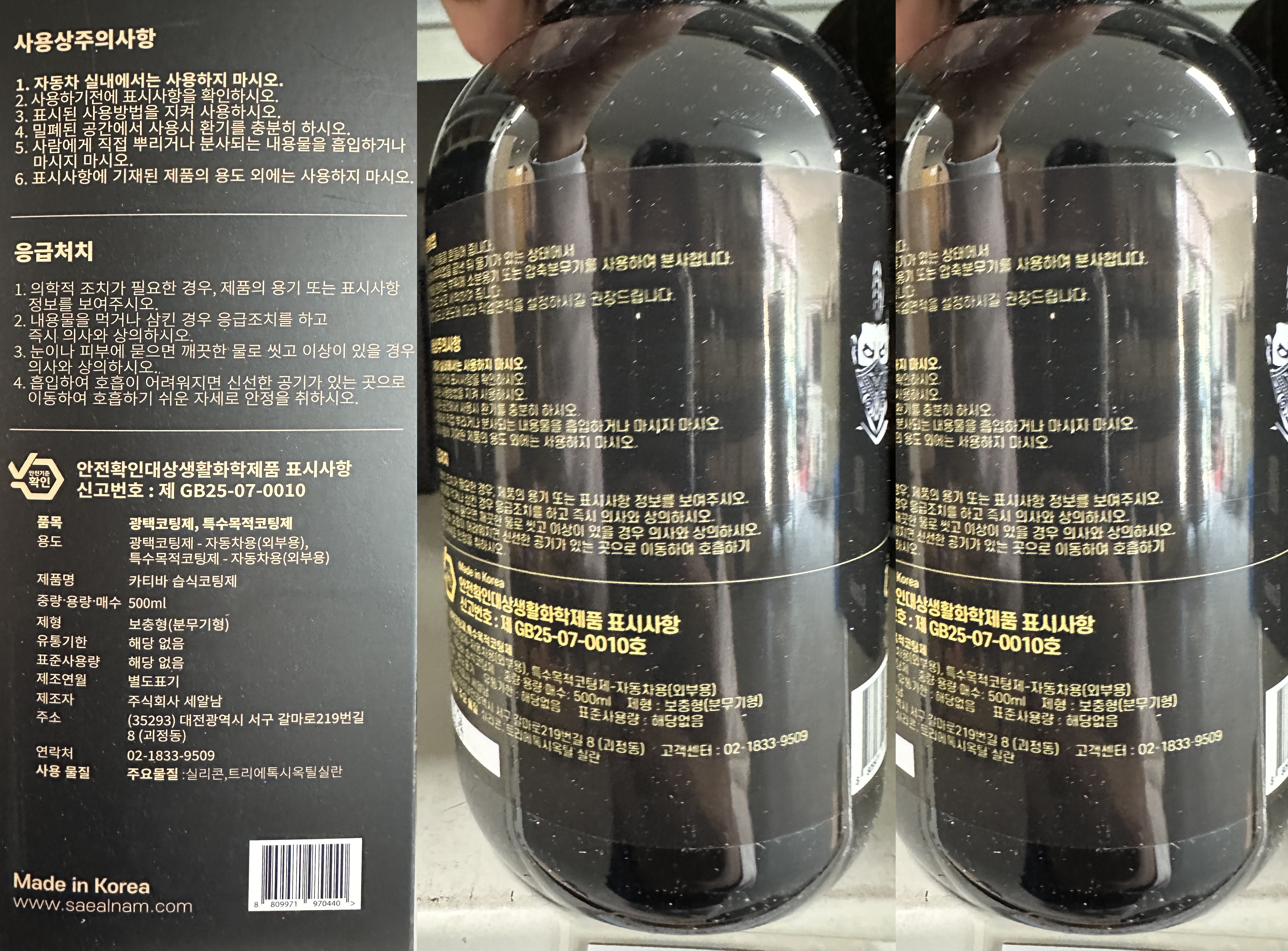 | 품목 및 제품명 | 광택코팅제, 특수목적코팅제/ 카티바 습식코팅제 | 용도(표백제의 경우 계열을 함께표시) 및 제형 | 광택코팅제 - 자동차용(외부용), 특수목적코팅제 - 자동차용(외부용)/ 보충형 (분무기형) |
