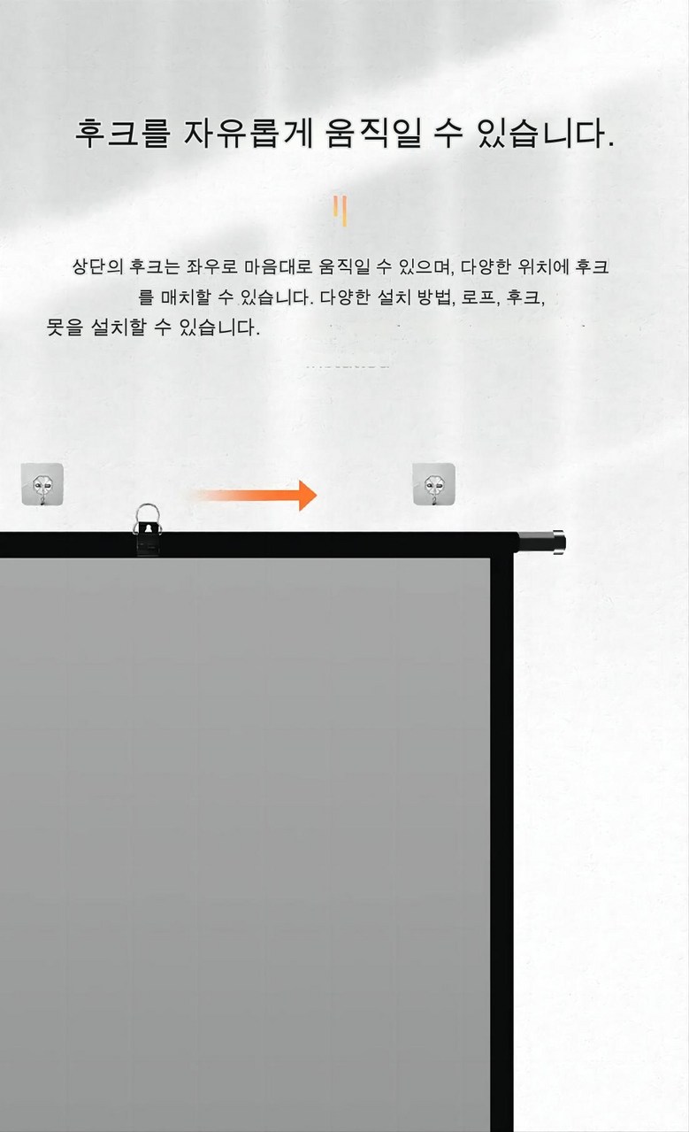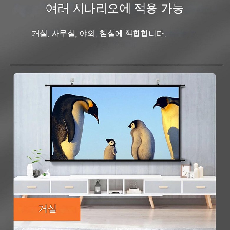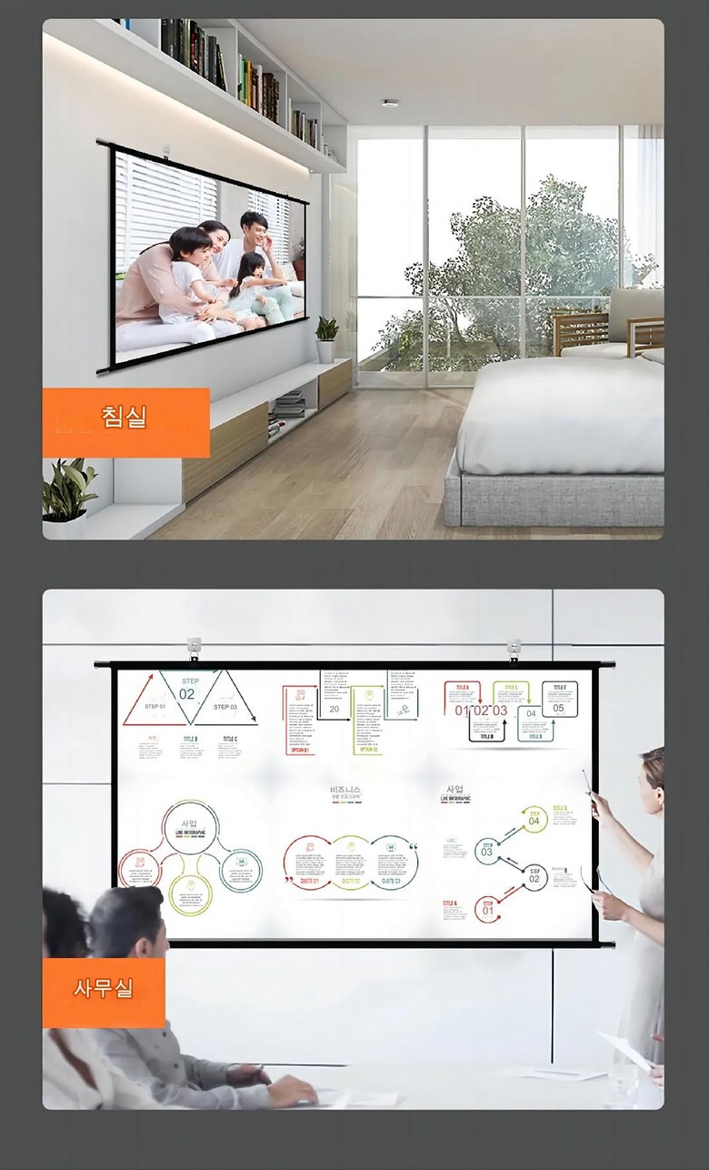 분해 및 휴대가 간편하여 실내외 어디서나 사용 가능한 벽걸이형 프로젝션 스크린입니다.