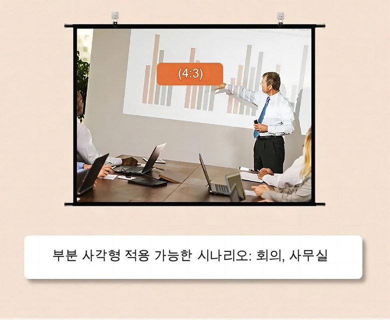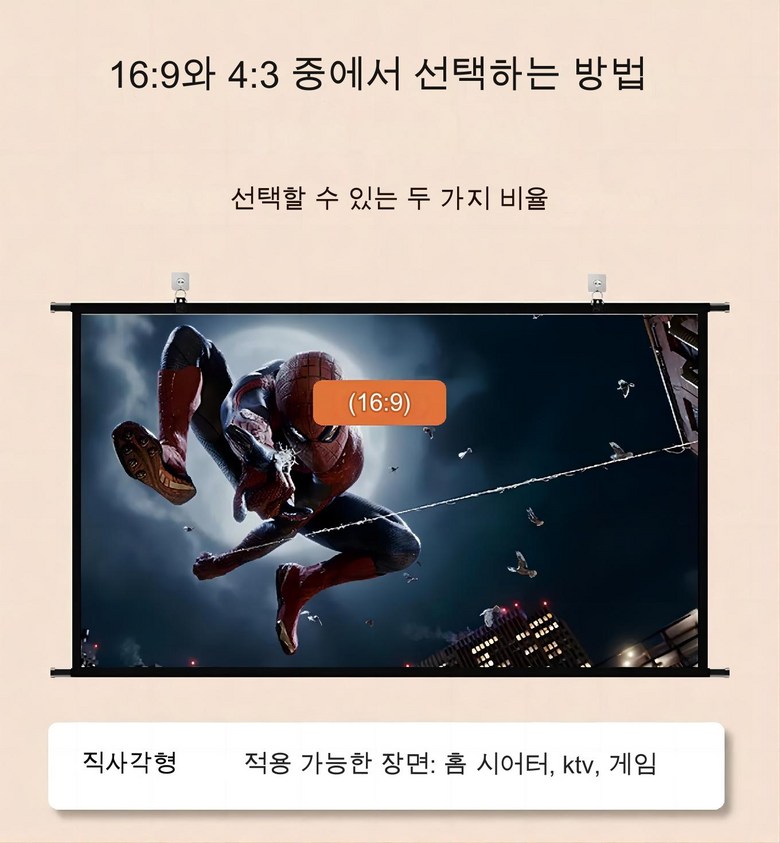 60~120인치 크기, 16:9 또는 4:3 화면비, 40-60° 광시야각으로 선명하고 생생한 색상을 제공합니다.