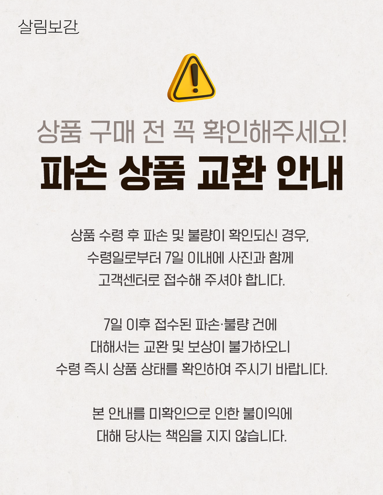 - ㆍ모니터 해상도의 차이로 인해 색상이나 이미지가 실제와 달라, 고객이 단순 변심으로 교환/반품을 무료로 요청하는 경우