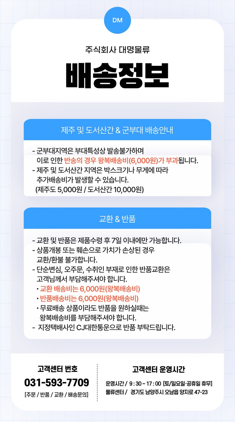 | 교환/반품 비용 (왕복비용) | 6,000원 - 단, 고객 변심의 경우에만 발생 - 도서산간 및 일부 지역 추가비용 발생 |