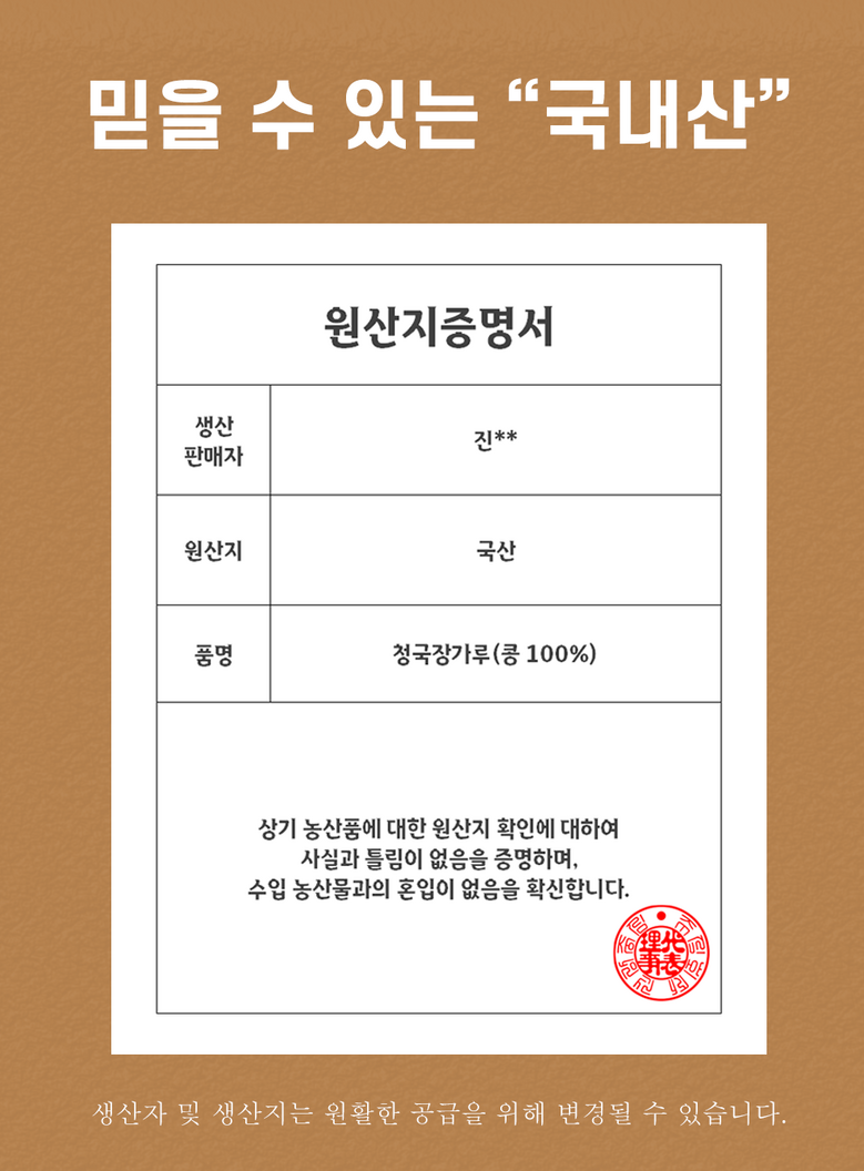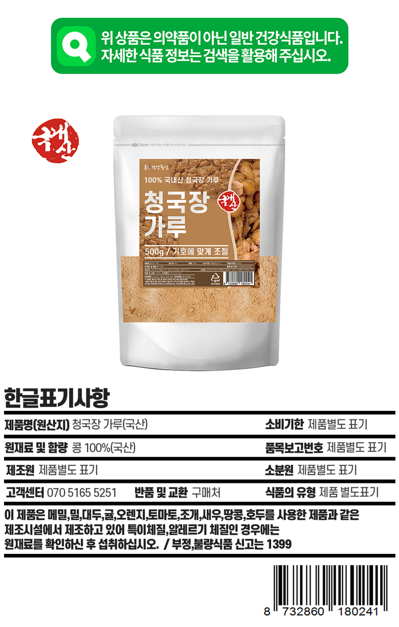 | 포장단위별 내용물의 용량(중량), 수량 | 500g | 원재료명 및 함량 | 콩 100%(국산) |