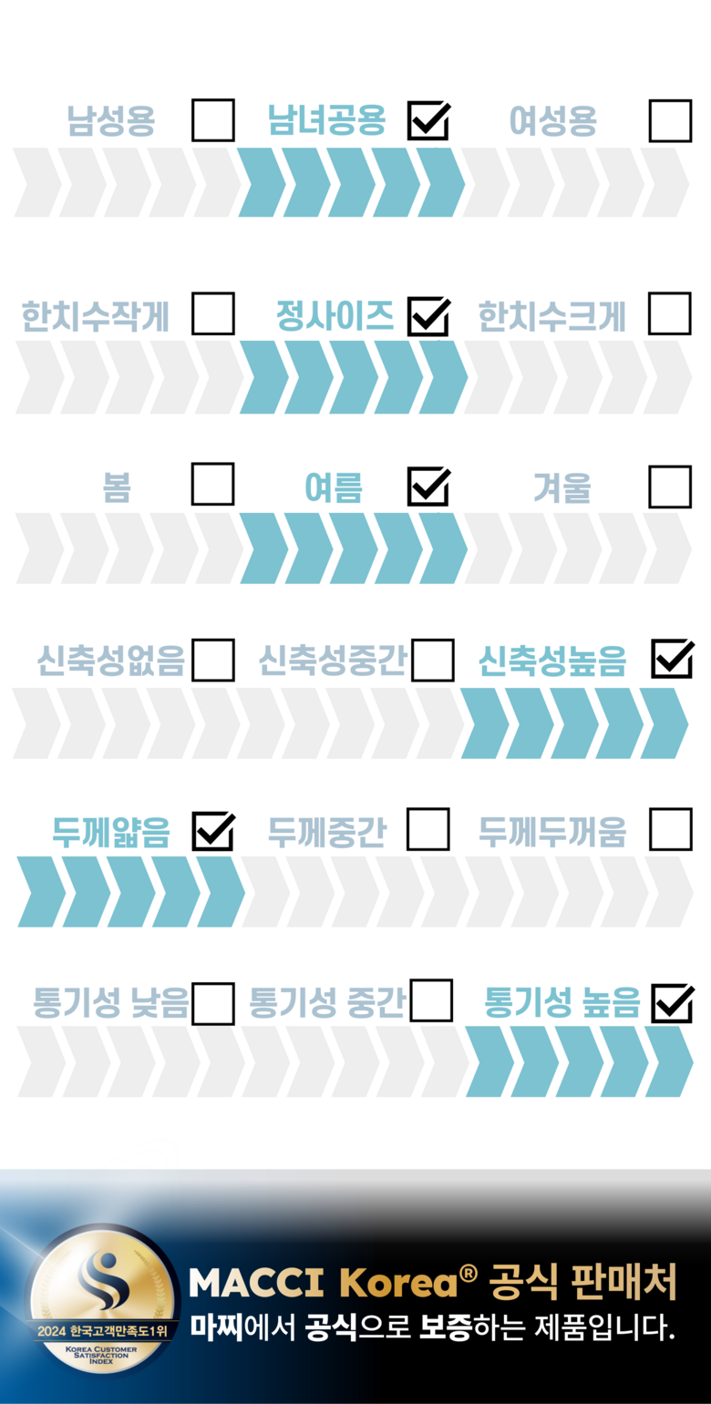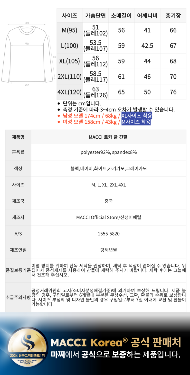 | 치수 | M(95), L(100), XL(105), XXL(110), 4XL(120) | 제조자(수입자) | 신성어패럴 |