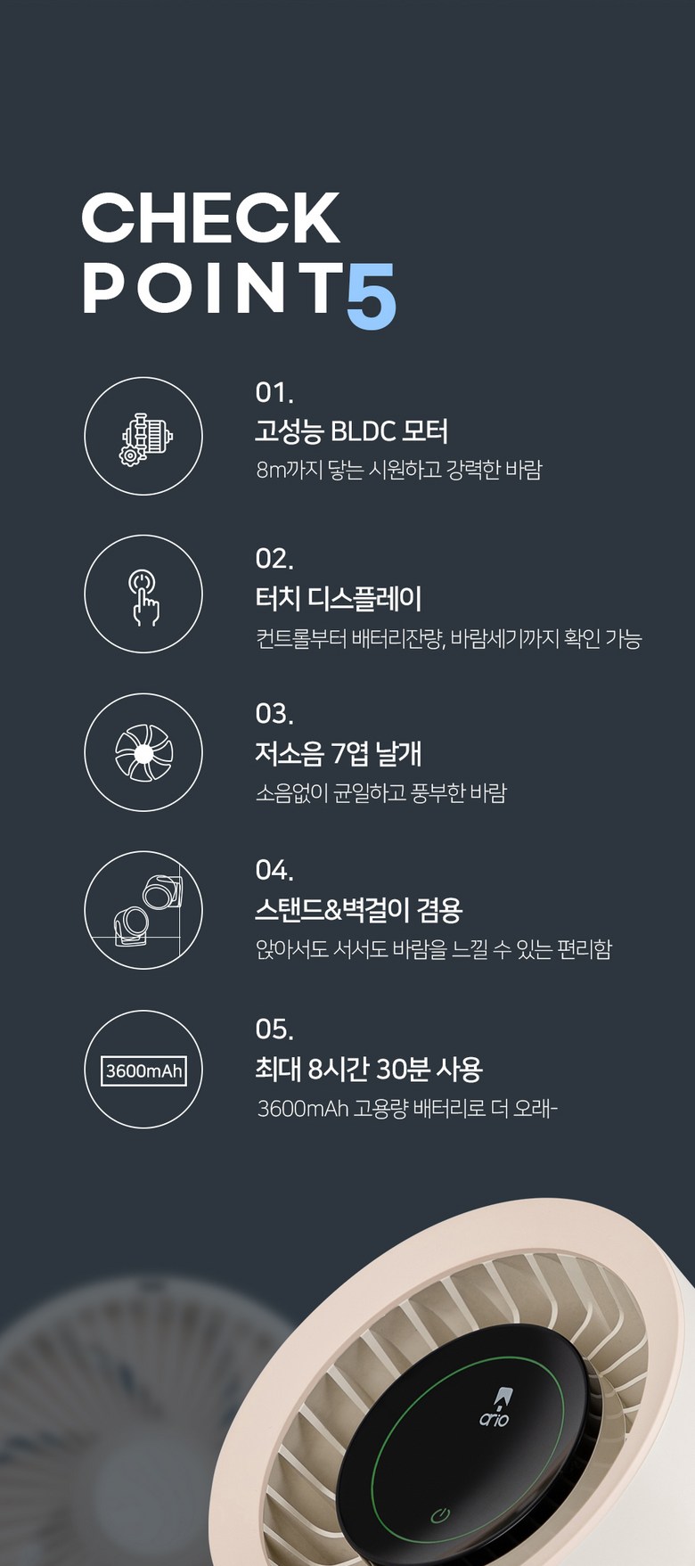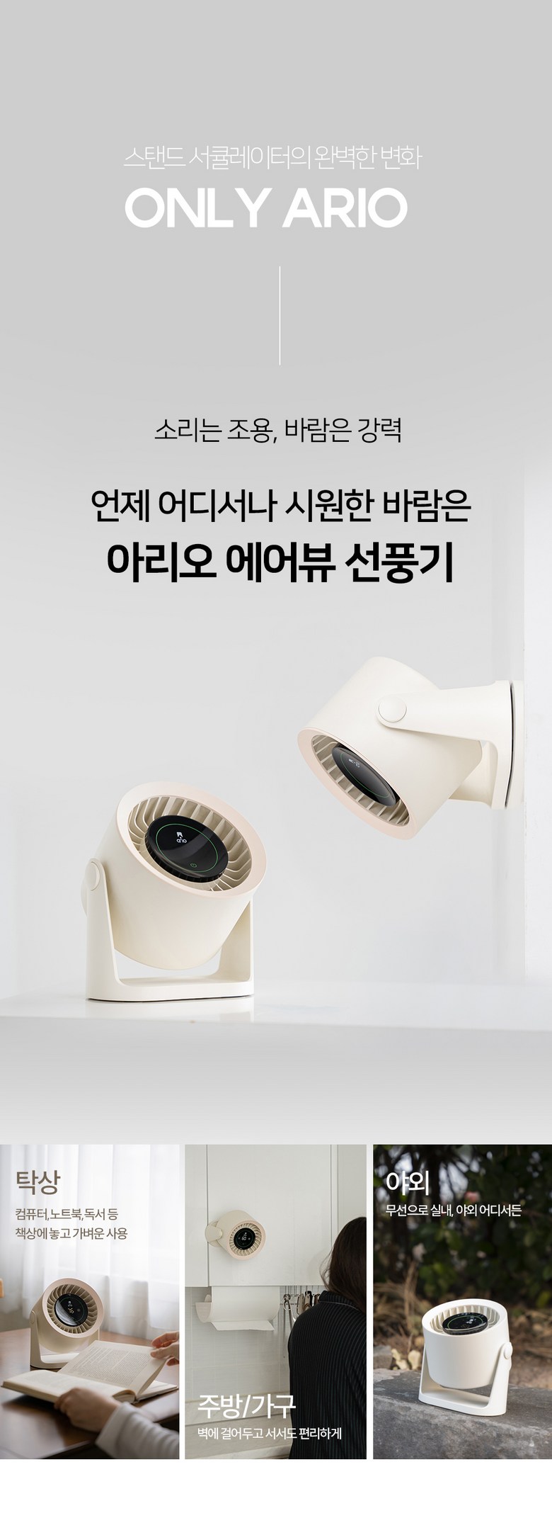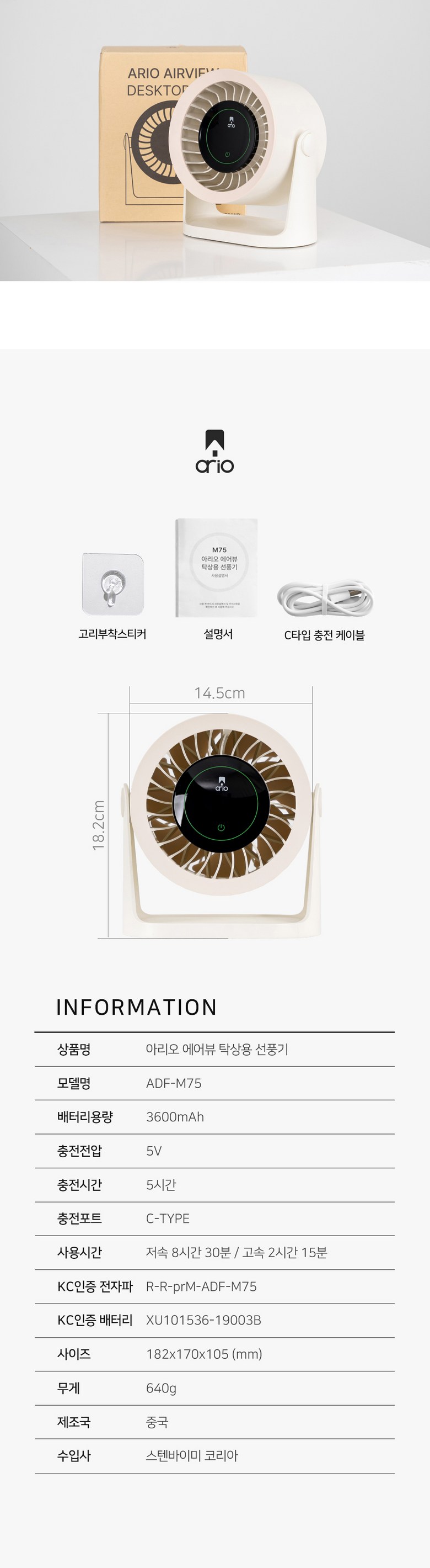 | 품명 및 모델명 | 아리오 에어뷰 탁상용 선풍기 / ADF-M75 | KC 인증정보 | 전자파: R-R-prM-ADF-M75 / 배터리: XU101536-19003B |