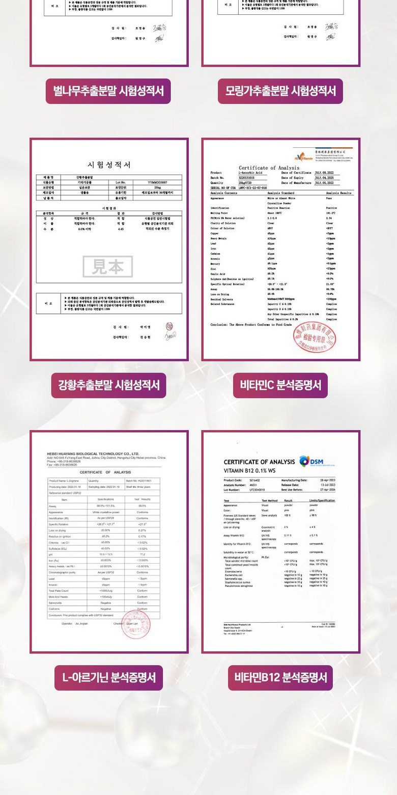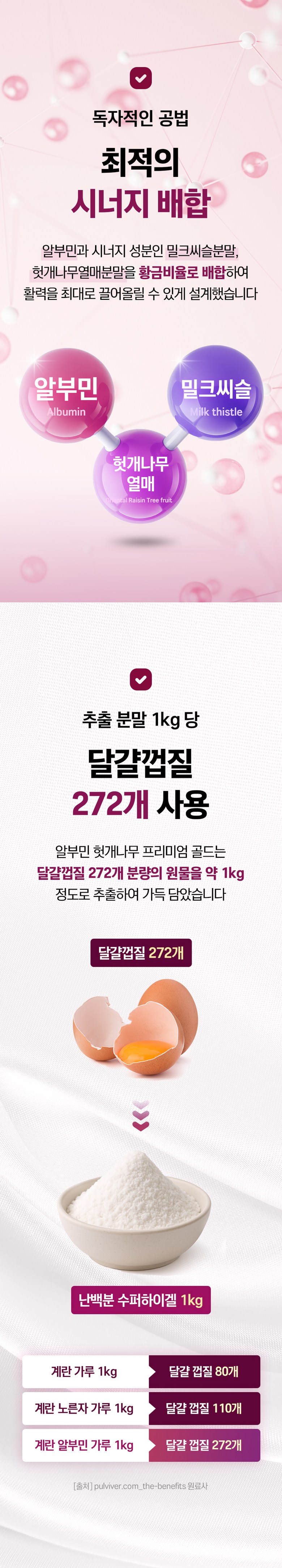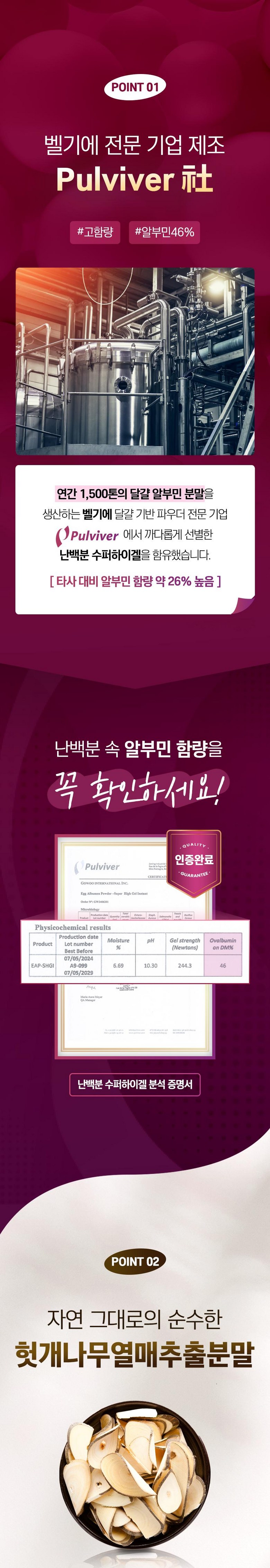 | 원료명 및 함량 | 난백분 수퍼하이겔[난백100%(알부민 46%)/벨기에산],헛개나무열매추출분말[헛개나무열매추출액(헛개나무열매/중국산),덱스트린,아라비아검],정제포도당,유기농 밀크씨슬분말(폴란드산),벌나무추출분말,모링가추출분말,강황추출분말,비타민C,L-아르기닌,결정셀룰로스,아미노산 혼합제제 BCAA(L-로이신,L-이소로이신,L-발린,레시틴),비타민B12(혼합제제)0.1WS(말토덱스트린,구연산,구연산나트륨,비타민B12),이산화규소,스테아린산마그네슘,계란 함유 | 영양정보 | 난백분 수퍼하이겔[난백100%(알부민 46%)/벨기에산],헛개나무열매추출분말[헛개나무열매추출액(헛개나무열매/중국산),덱스트린,아라비아검],정제포도당,유기농 밀크씨슬분말(폴란드산),벌나무추출분말,모링가추출분말,강황추출분말,비타민C,L-아르기닌,결정셀룰로스,아미노산 혼합제제 BCAA(L-로이신,L-이소로이신,L-발린,레시틴),비타민B12(혼합제제)0.1WS(말토덱스트린,구연산,구연산나트륨,비타민B12),이산화규소,스테아린산마그네슘,계란 함유 |