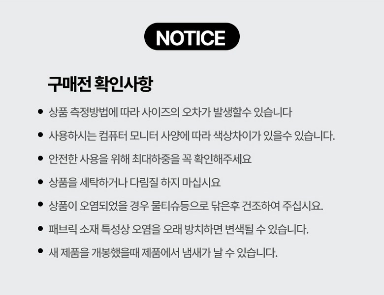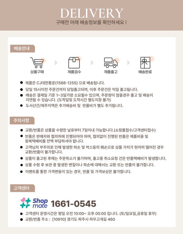 - ㆍ모니터 해상도의 차이로 인해 색상이나 이미지가 실제와 달라, 고객이 단순 변심으로 교환/반품을 무료로 요청하는 경우
