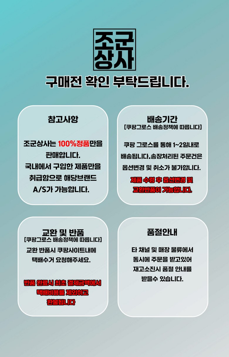 - ㆍ교환/반품에 관한 일반적인 사항은 판매자가 제시사항보다 관계법령이 우선합니다.