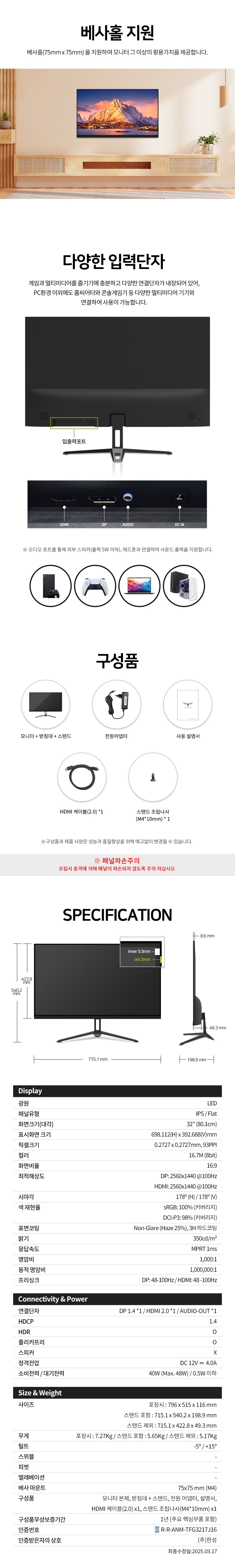 | 품명 및 모델명 | 모니터 / TFG32Q10P | KC 인증정보 | 유/KC마크 , R-R-ANM-TFG3217J16 |