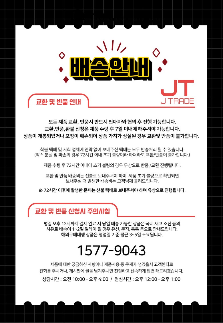 - ㆍ교환/반품에 관한 일반적인 사항은 판매자가 제시사항보다 관계법령이 우선합니다.