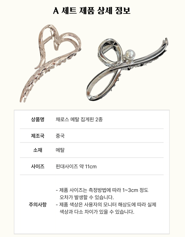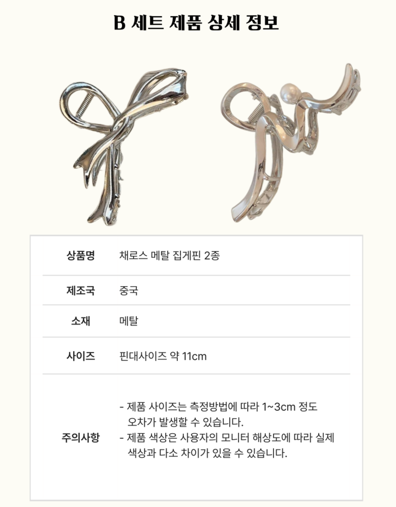 | 종류 | 채로스 실버 집게핀 | 소재 | 메탈 |