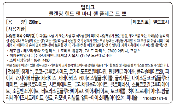| 사용기한 또는 개봉 후 사용기간 | 본 상품은 해당 물류센터 직발송 상품인 관계로 제조연월일 및 사용기한 정보가 매번 변경되므로 상단 사용기한 정보를 참고해 주세요. | 사용방법 | 손을 닦을 때나, 샤워 시에 거품을 풍부하게 내어 사용합니다. |