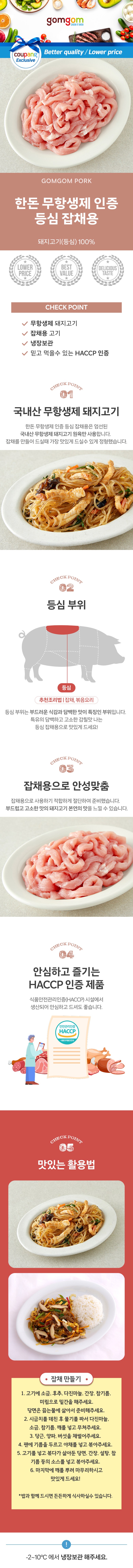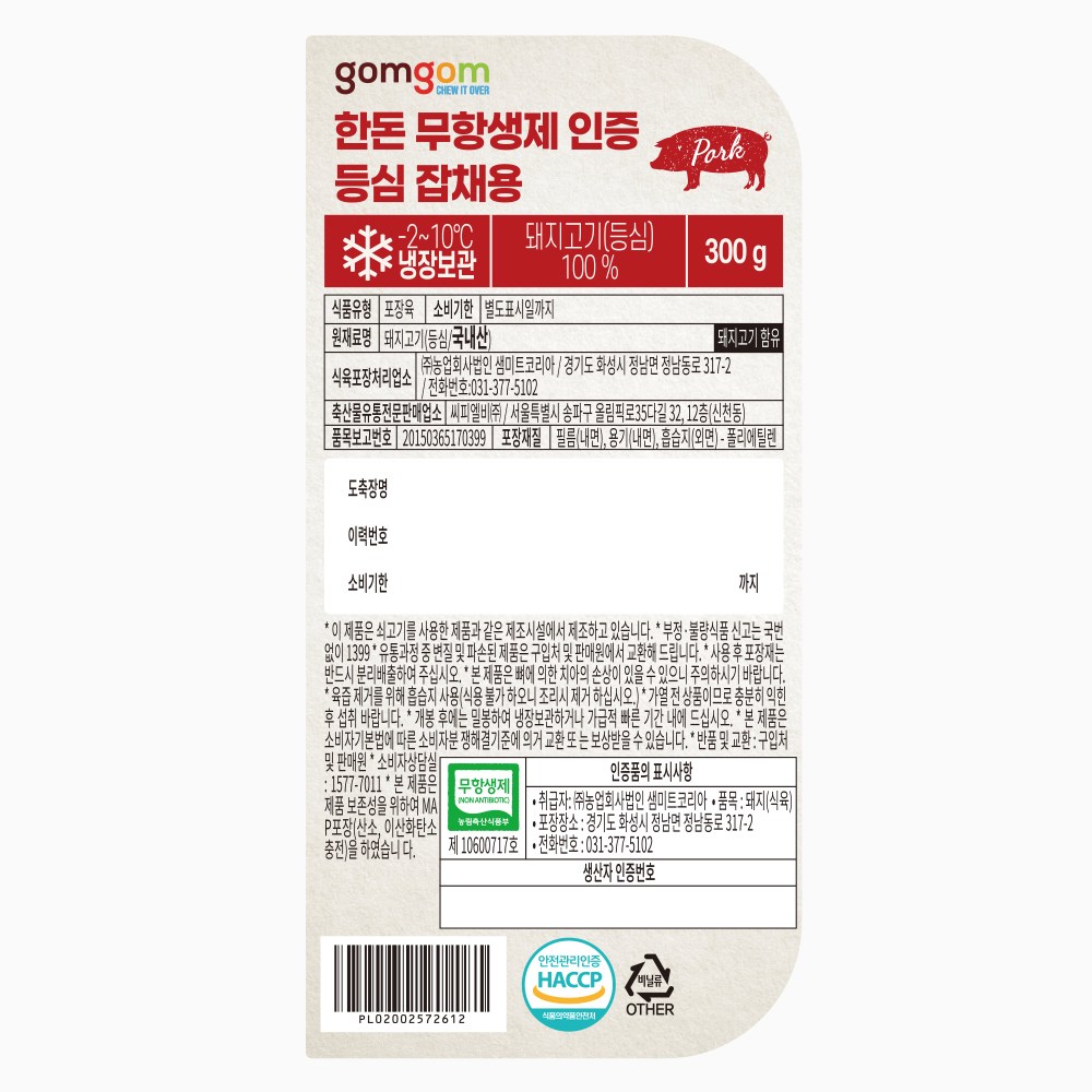 | 품목 또는 명칭 | 한돈 무항생제 인증 등심 잡채용 | 포장단위별 내용물의 용량(중량),수량,크기 | 300g |