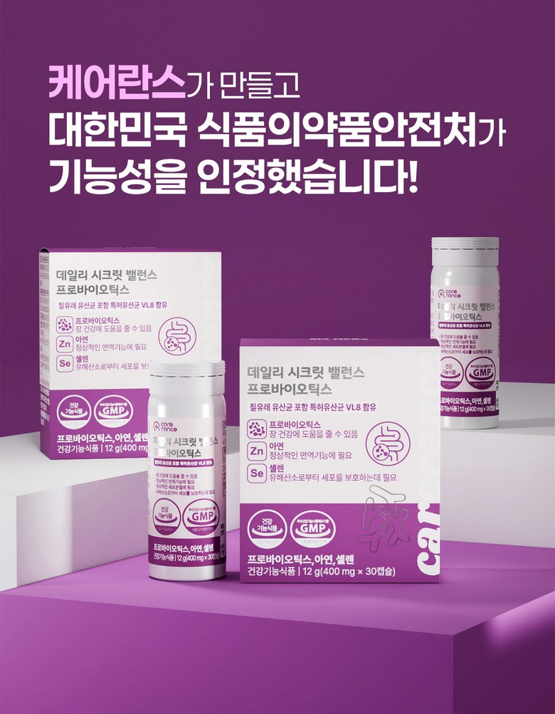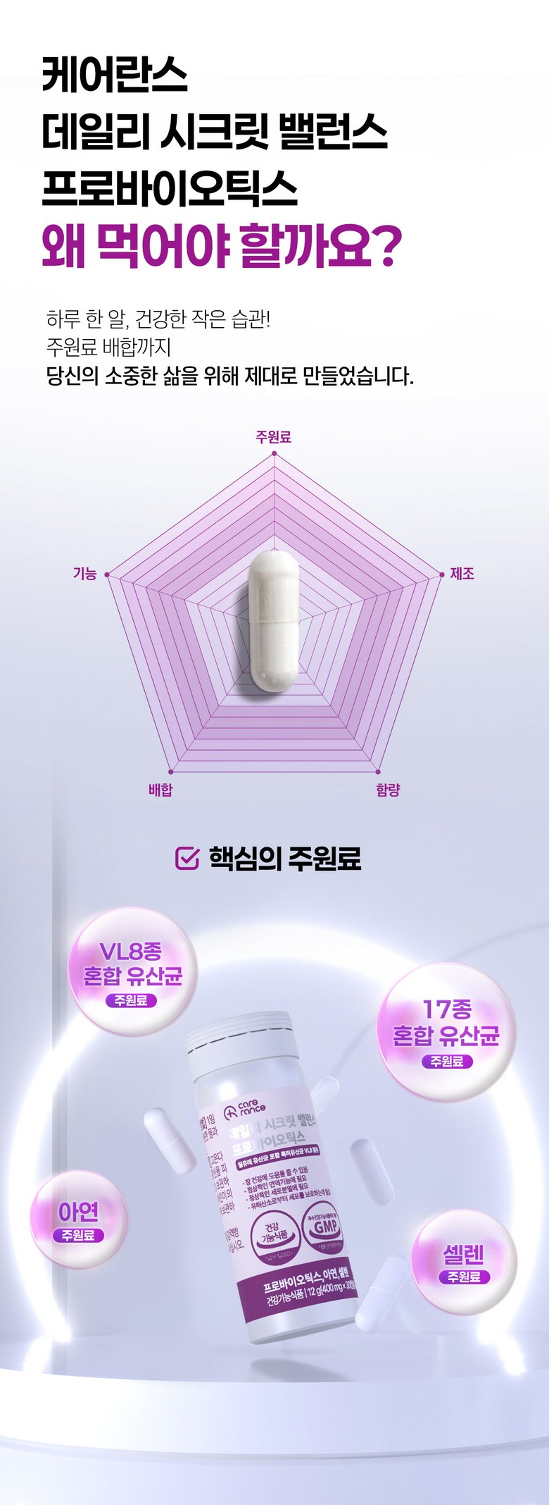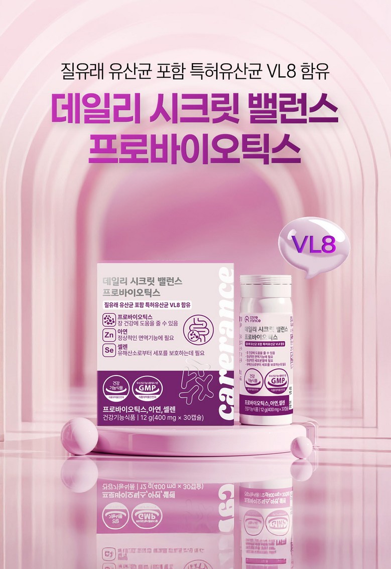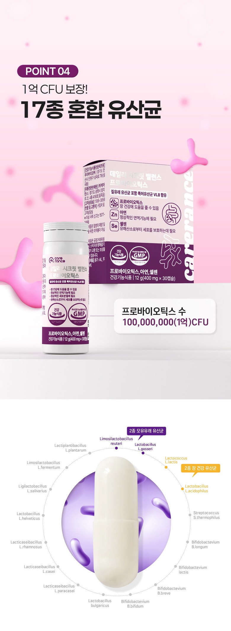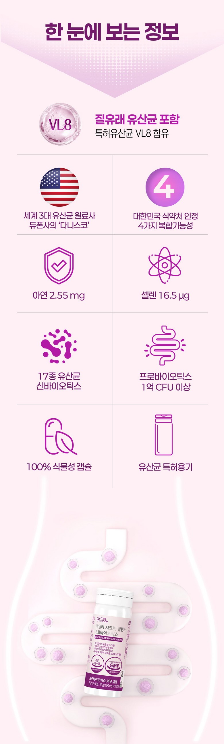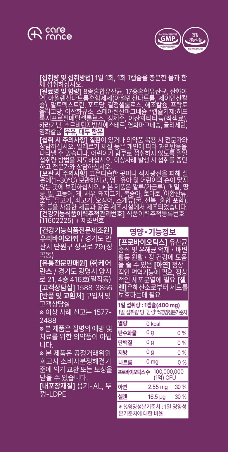| 원료명 및 함량 | [원료명 및 함량] 8종혼합유산균, 17종혼합유산균, 산화아연, 아셀렌산나트륨혼합제제(아셀렌산나트륨, 제이인산칼슘), 말토덱스트린, 포도당, 결정셀룰로스, 해조칼슘, 프락토올리고당, 이산화규소, 스테아린산마그네슘 *캡슐기제 : 히드록시프로필메틸셀룰로스, 정제수, 이산화티타늄(착색료), 카라기난, 소르비탄지방산에스테르, 염화마그네슘, 글리세린, 염화칼륨, 우유, 대두 함유 | 영양정보 | 1일 섭취량 : 1캡슐(400 mg) 1일 섭취량 당 함량 %영양성분기준치 : 열량 0 kcal, 탄수화물 0 g(0 %), 단백질 0 g(0 %), 지방 0 g(0 %), 나트륨 0 mg(0 %), 프로바이오틱스수 100,000,000(1억) CFU, 아연 2.55 mg(30 %), 셀렌 16.5 μg(30 %) ※ %영양성분기준치 : 1일 영양성분기준치에 대한 비율 |