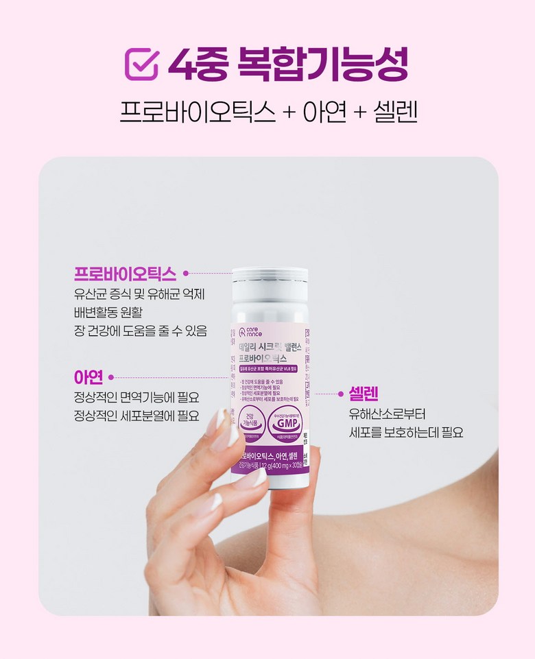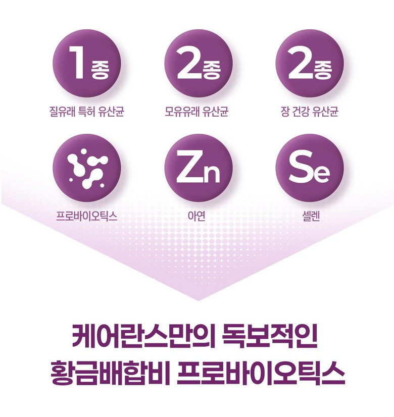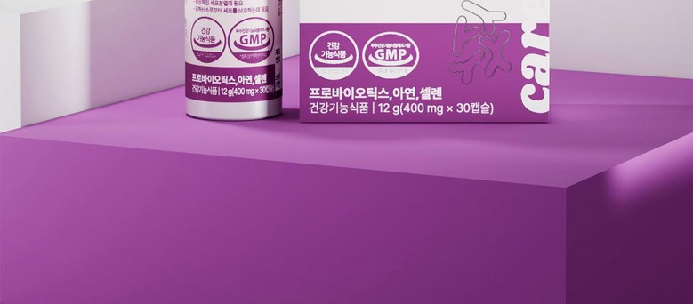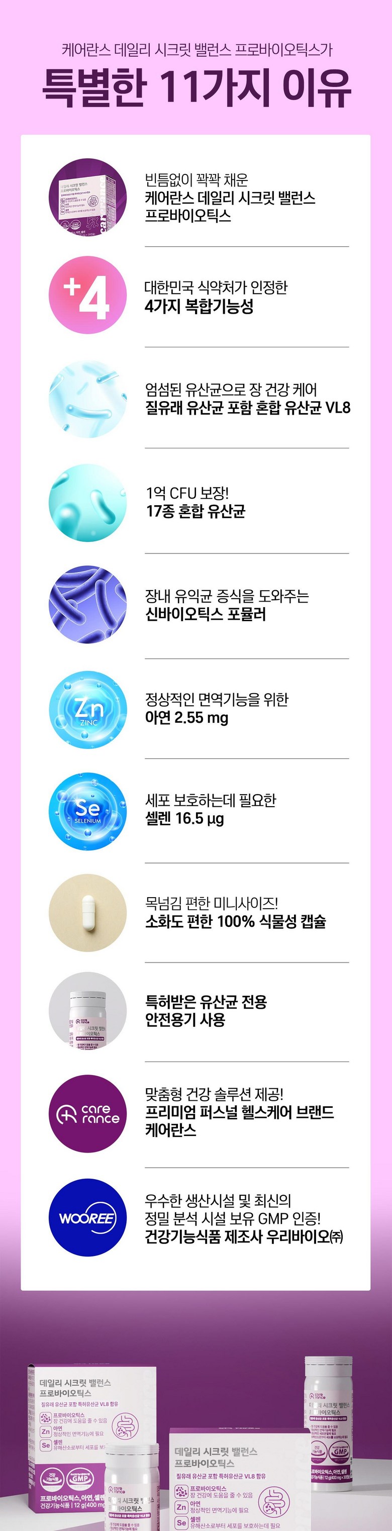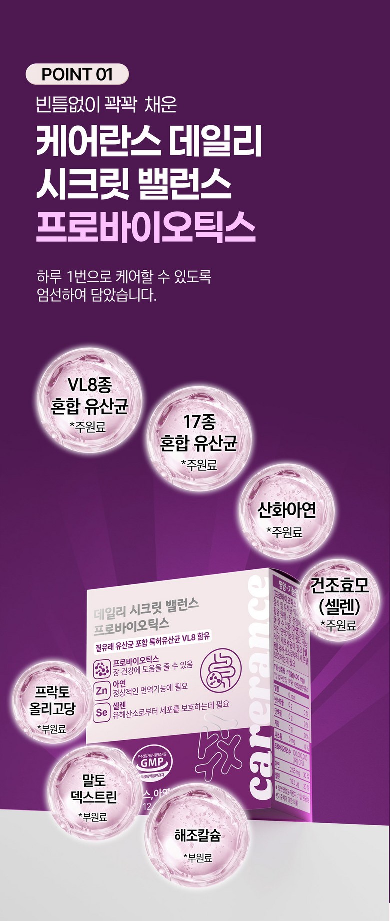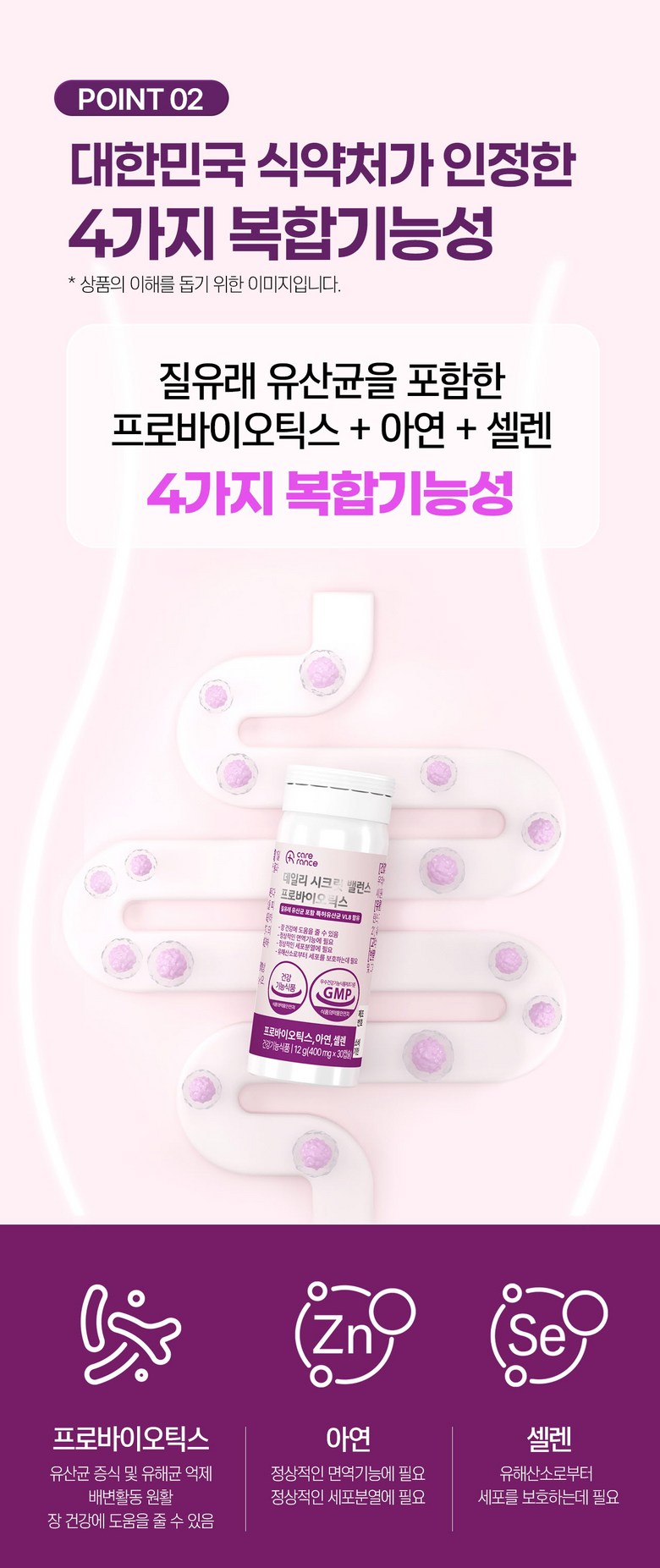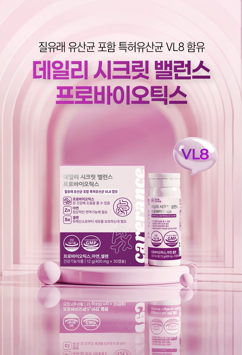 | 원료명 및 함량 | [원료명 및 함량] 8종혼합유산균, 17종혼합유산균, 산화아연, 아셀렌산나트륨혼합제제(아셀렌산나트륨, 제이인산칼슘), 말토덱스트린, 포도당, 결정셀룰로스, 해조칼슘, 프락토올리고당, 이산화규소, 스테아린산마그네슘 *캡슐기제 : 히드록시프로필메틸셀룰로스, 정제수, 이산화티타늄(착색료), 카라기난, 소르비탄지방산에스테르, 염화마그네슘, 글리세린, 염화칼륨, 우유, 대두 함유 | 영양정보 | 1일 섭취량 : 1캡슐(400 mg) 1일 섭취량 당 함량 %영양성분기준치 : 열량 0 kcal, 탄수화물 0 g(0 %), 단백질 0 g(0 %), 지방 0 g(0 %), 나트륨 0 mg(0 %), 프로바이오틱스수 100,000,000(1억) CFU, 아연 2.55 mg(30 %), 셀렌 16.5 μg(30 %) ※ %영양성분기준치 : 1일 영양성분기준치에 대한 비율 |