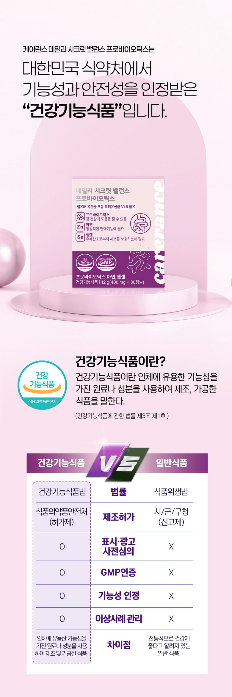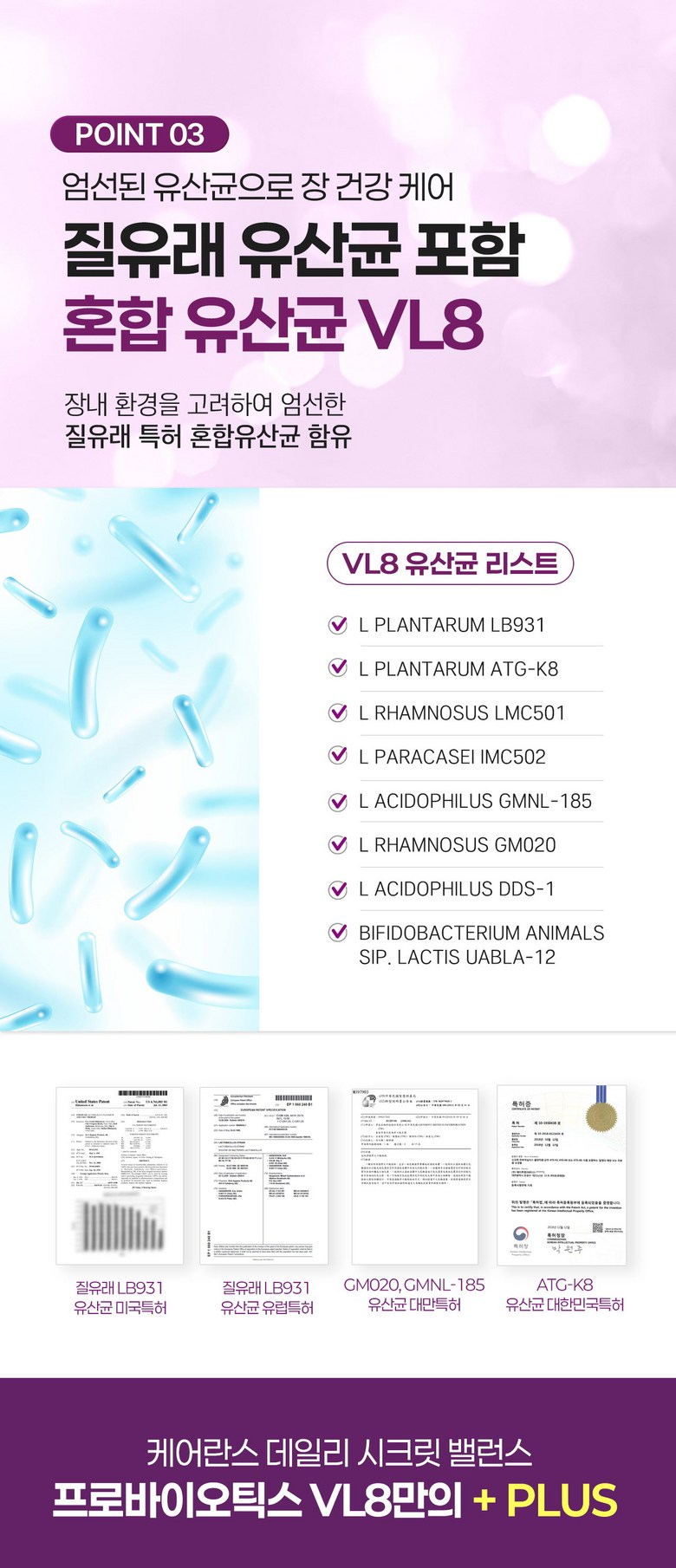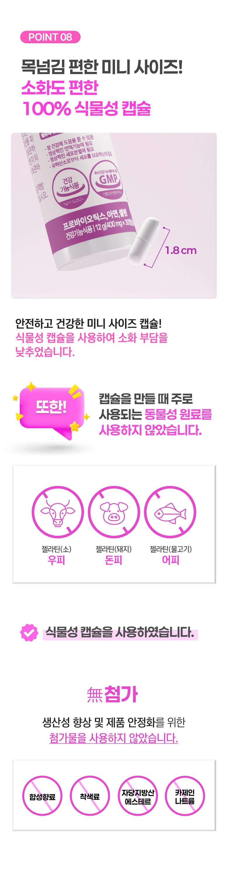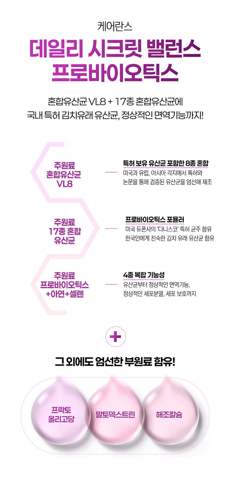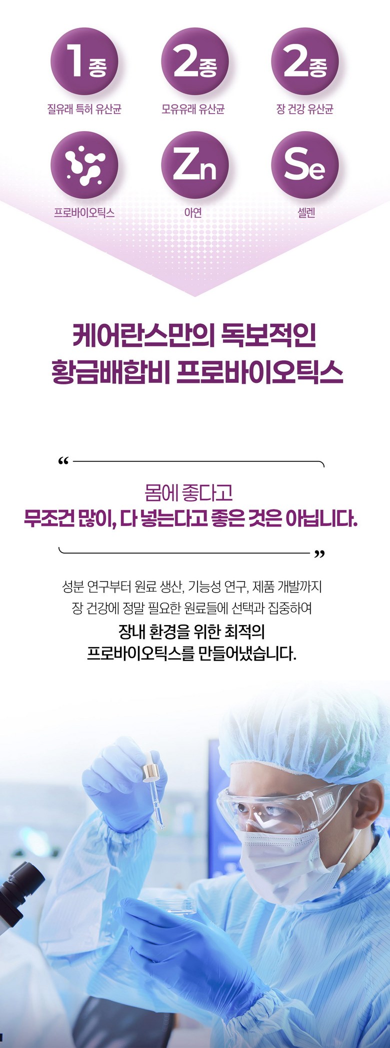 | 원료명 및 함량 | [원료명 및 함량] 8종혼합유산균, 17종혼합유산균, 산화아연, 아셀렌산나트륨혼합제제(아셀렌산나트륨, 제이인산칼슘), 말토덱스트린, 포도당, 결정셀룰로스, 해조칼슘, 프락토올리고당, 이산화규소, 스테아린산마그네슘 *캡슐기제 : 히드록시프로필메틸셀룰로스, 정제수, 이산화티타늄(착색료), 카라기난, 소르비탄지방산에스테르, 염화마그네슘, 글리세린, 염화칼륨, 우유, 대두 함유 | 영양정보 | 1일 섭취량 : 1캡슐(400 mg) 1일 섭취량 당 함량 %영양성분기준치 : 열량 0 kcal, 탄수화물 0 g(0 %), 단백질 0 g(0 %), 지방 0 g(0 %), 나트륨 0 mg(0 %), 프로바이오틱스수 100,000,000(1억) CFU, 아연 2.55 mg(30 %), 셀렌 16.5 μg(30 %) ※ %영양성분기준치 : 1일 영양성분기준치에 대한 비율 |
