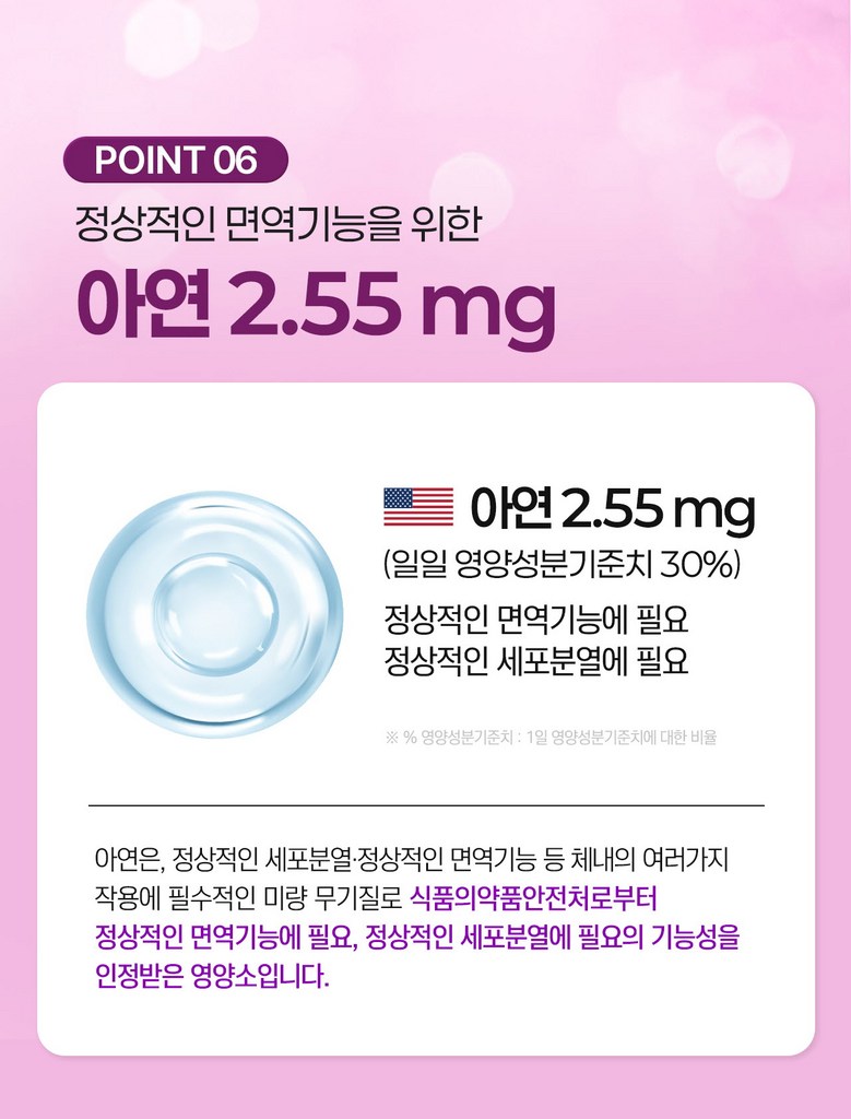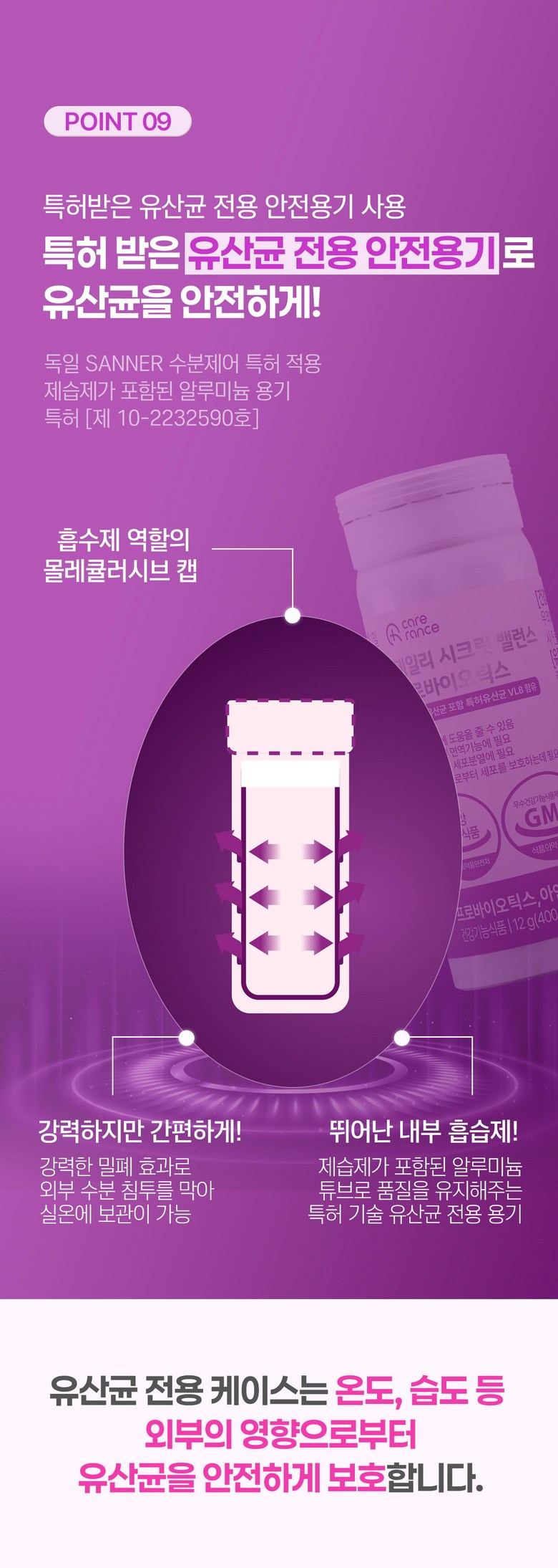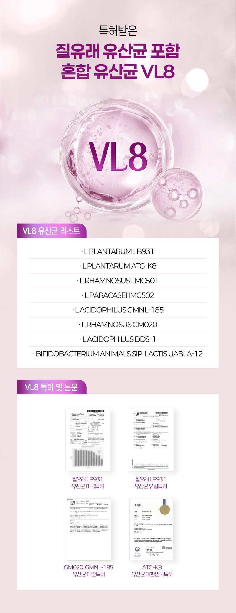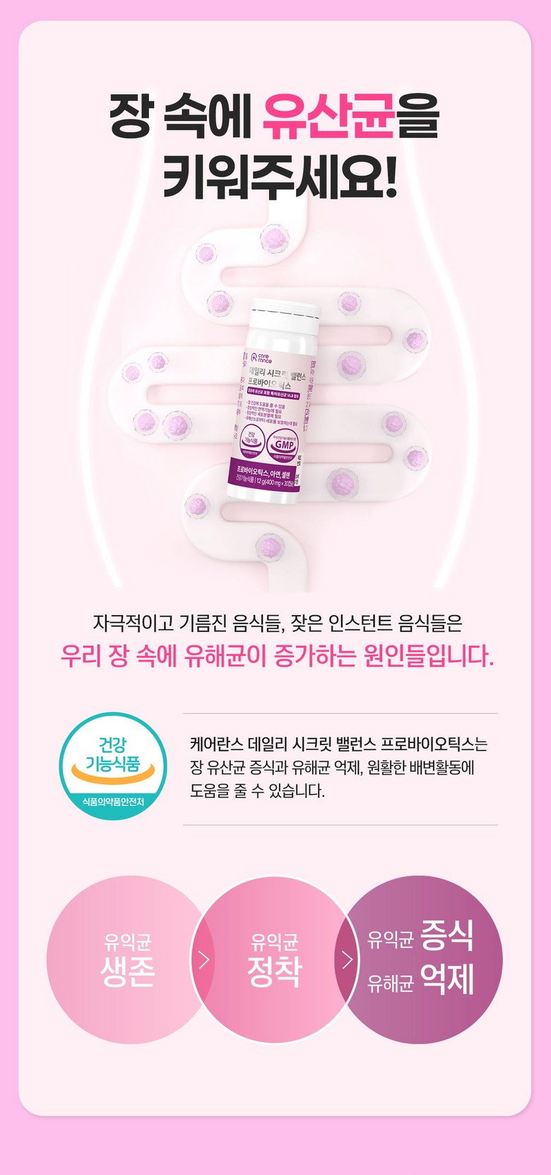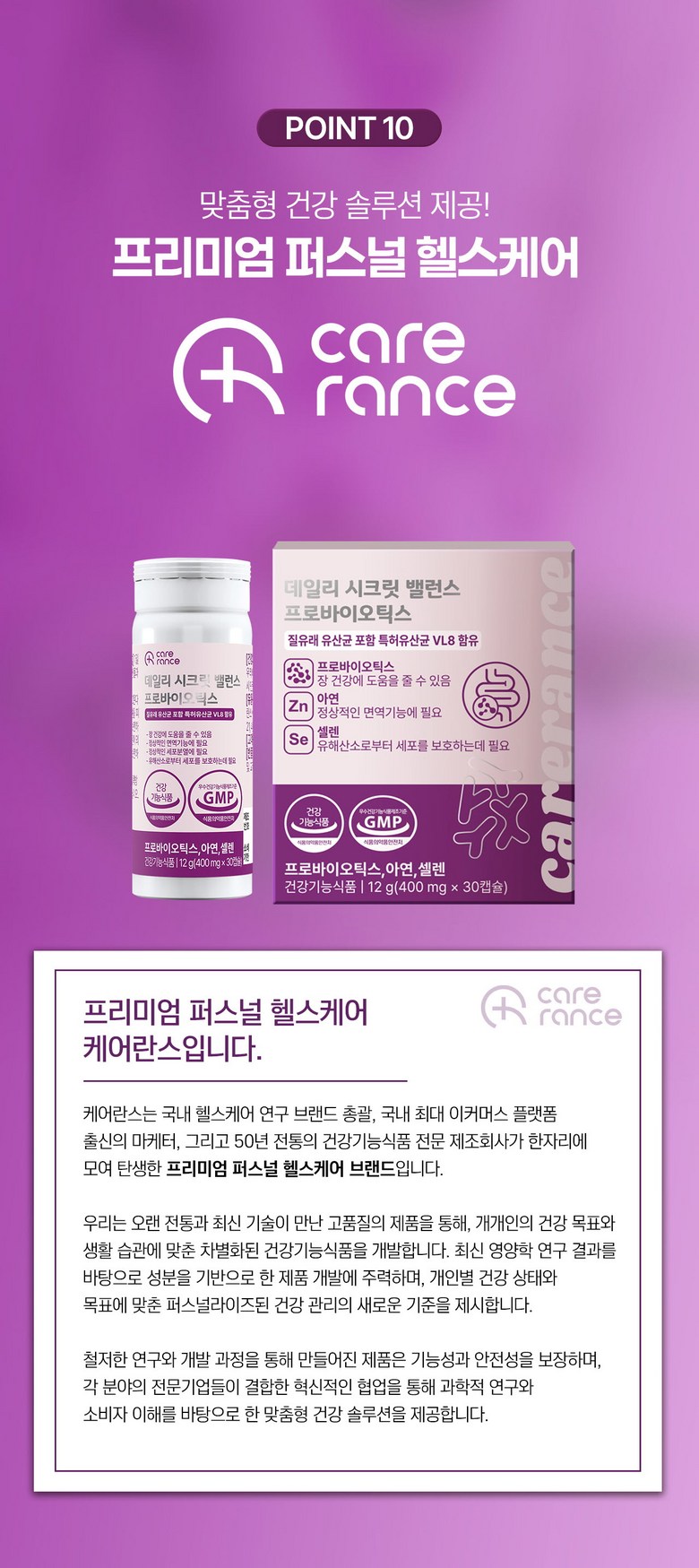 | 원료명 및 함량 | [원료명 및 함량] 8종혼합유산균, 17종혼합유산균, 산화아연, 아셀렌산나트륨혼합제제(아셀렌산나트륨, 제이인산칼슘), 말토덱스트린, 포도당, 결정셀룰로스, 해조칼슘, 프락토올리고당, 이산화규소, 스테아린산마그네슘 *캡슐기제 : 히드록시프로필메틸셀룰로스, 정제수, 이산화티타늄(착색료), 카라기난, 소르비탄지방산에스테르, 염화마그네슘, 글리세린, 염화칼륨, 우유, 대두 함유 | 영양정보 | 1일 섭취량 : 1캡슐(400 mg) 1일 섭취량 당 함량 %영양성분기준치 : 열량 0 kcal, 탄수화물 0 g(0 %), 단백질 0 g(0 %), 지방 0 g(0 %), 나트륨 0 mg(0 %), 프로바이오틱스수 100,000,000(1억) CFU, 아연 2.55 mg(30 %), 셀렌 16.5 μg(30 %) ※ %영양성분기준치 : 1일 영양성분기준치에 대한 비율 |