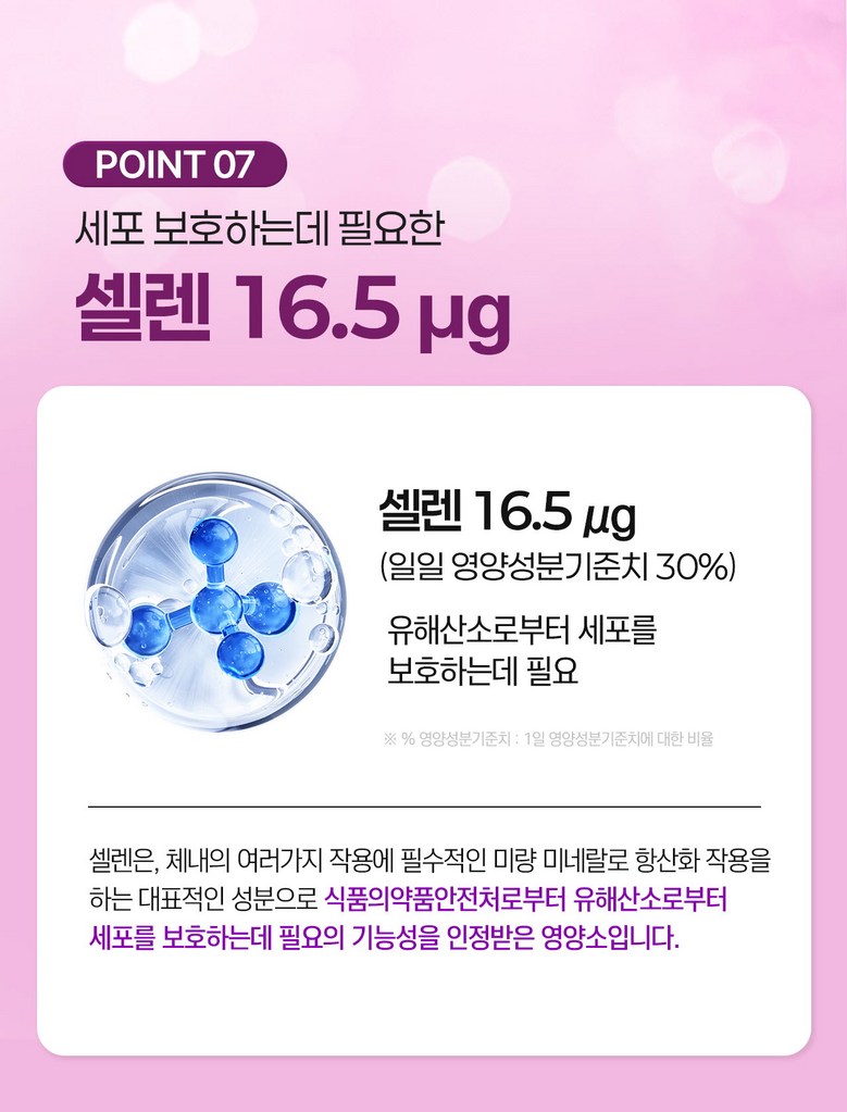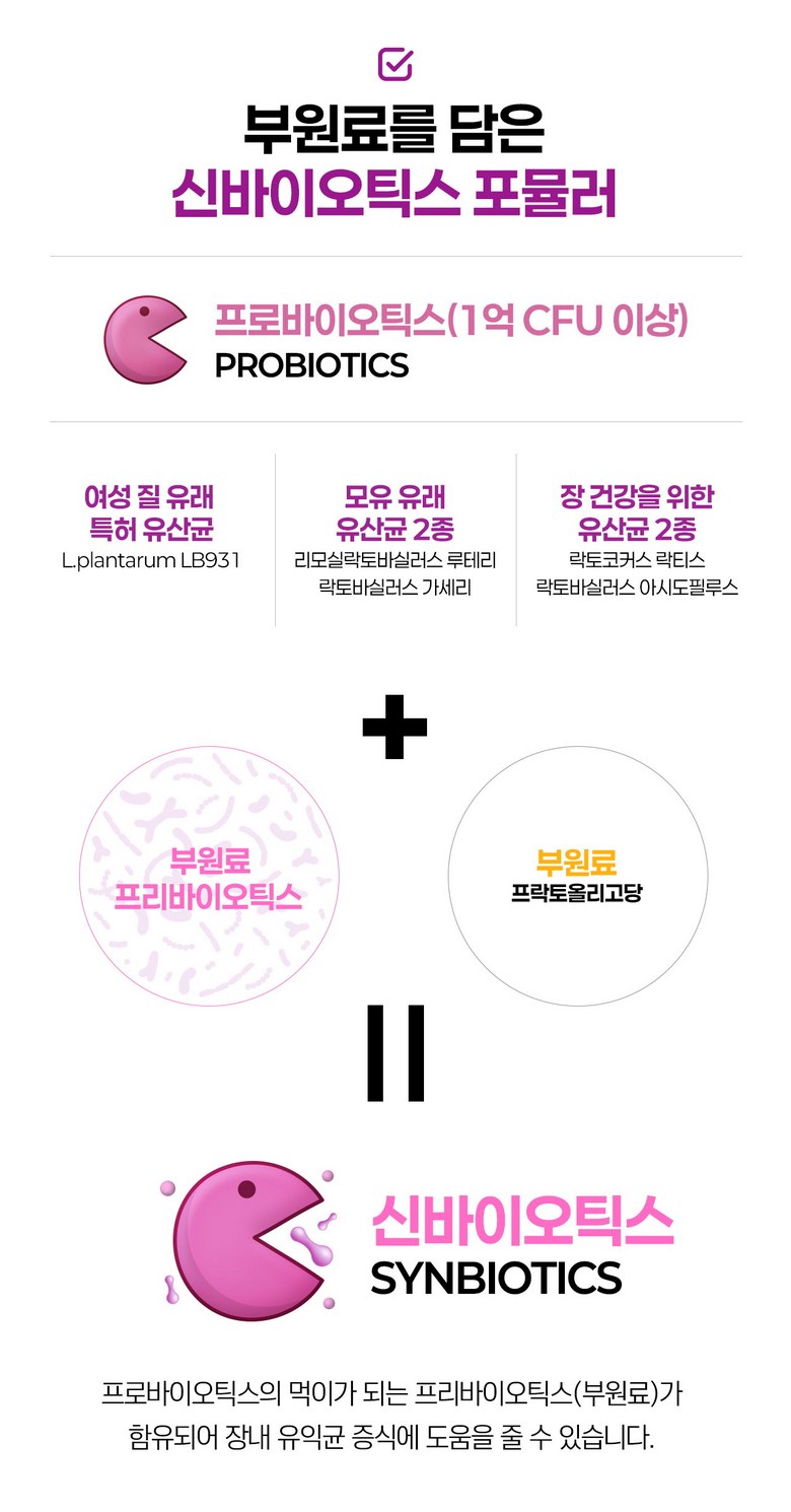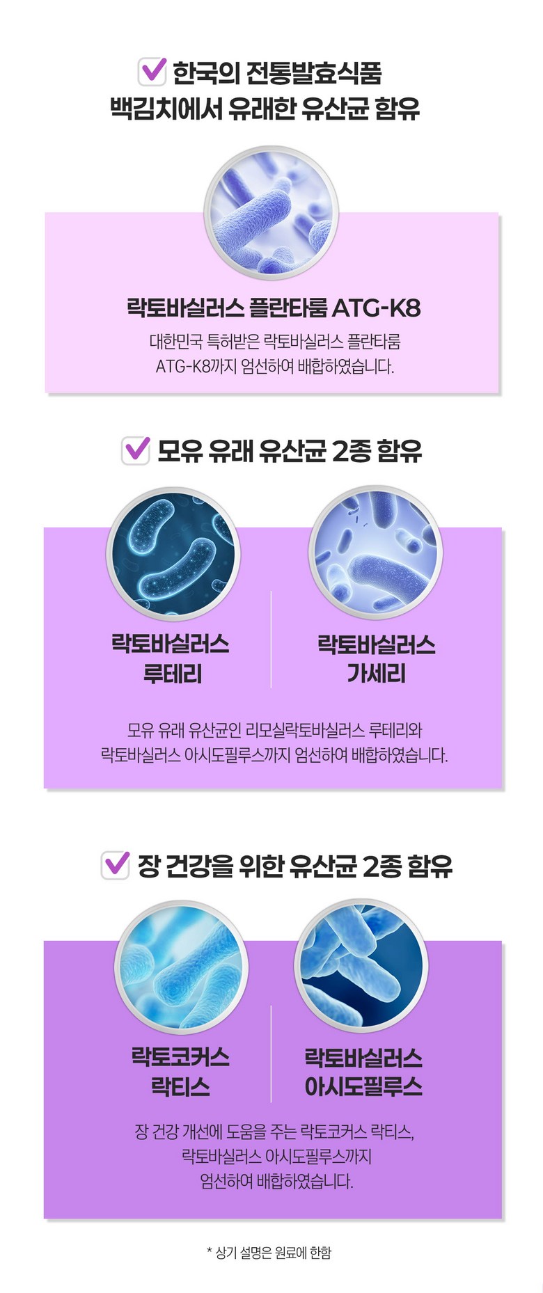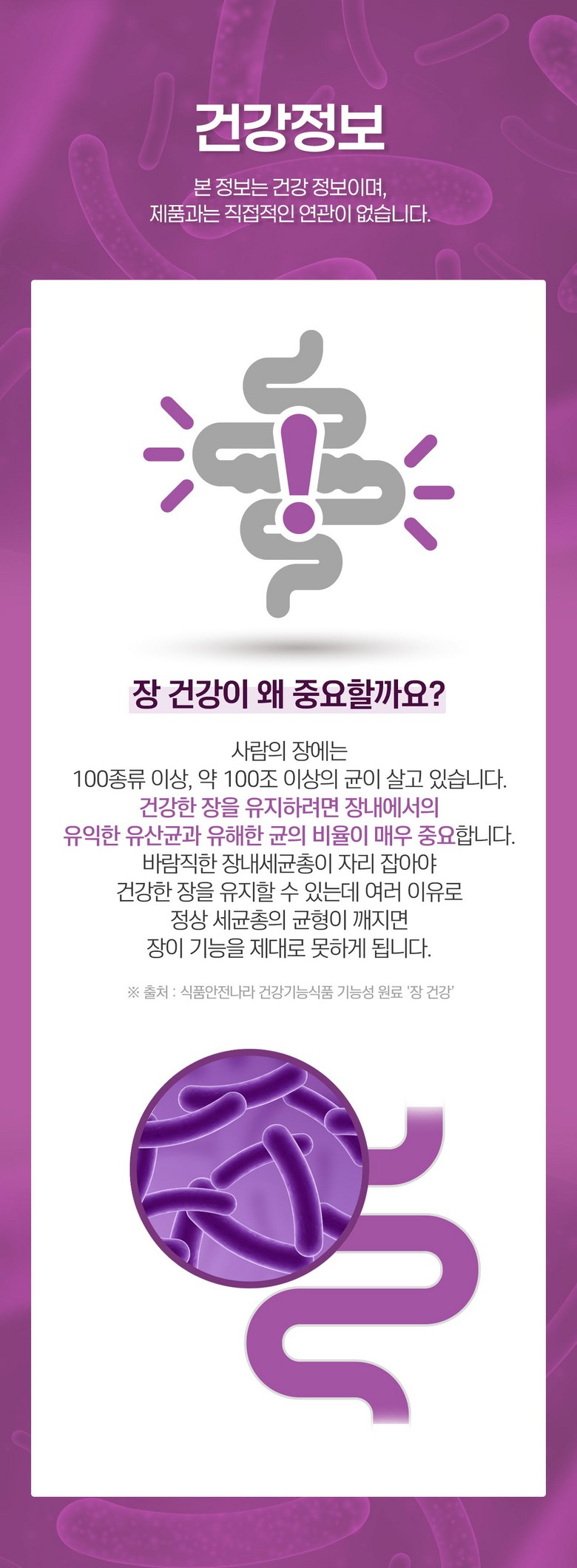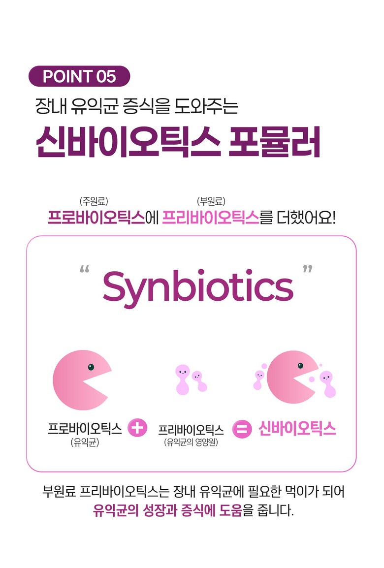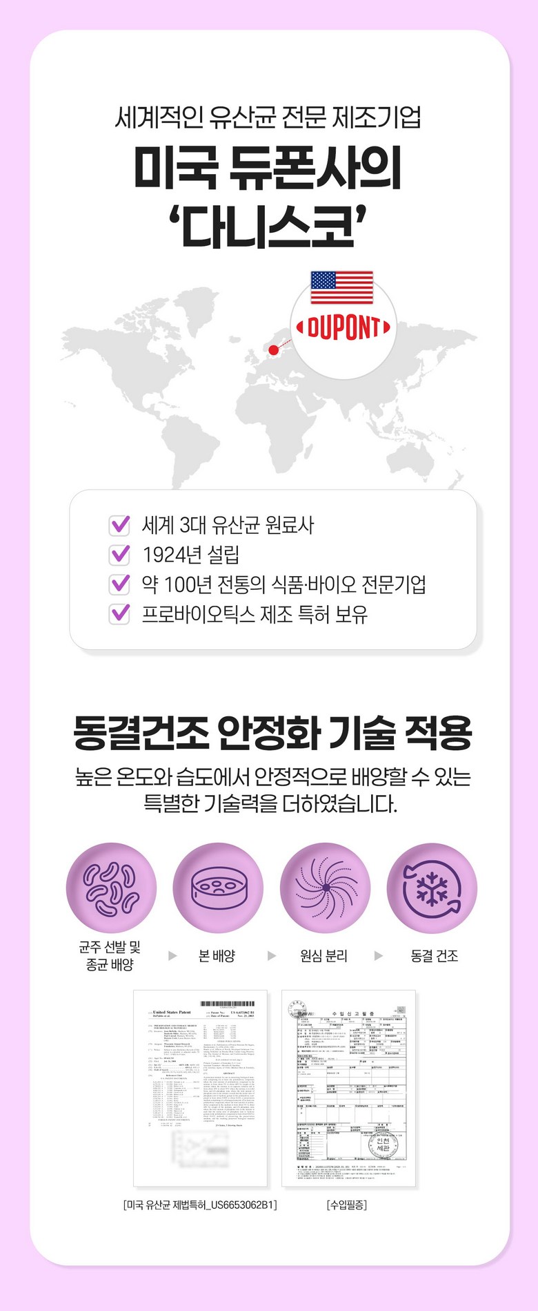 | 원료명 및 함량 | [원료명 및 함량] 8종혼합유산균, 17종혼합유산균, 산화아연, 아셀렌산나트륨혼합제제(아셀렌산나트륨, 제이인산칼슘), 말토덱스트린, 포도당, 결정셀룰로스, 해조칼슘, 프락토올리고당, 이산화규소, 스테아린산마그네슘 *캡슐기제 : 히드록시프로필메틸셀룰로스, 정제수, 이산화티타늄(착색료), 카라기난, 소르비탄지방산에스테르, 염화마그네슘, 글리세린, 염화칼륨, 우유, 대두 함유 | 영양정보 | 1일 섭취량 : 1캡슐(400 mg) 1일 섭취량 당 함량 %영양성분기준치 : 열량 0 kcal, 탄수화물 0 g(0 %), 단백질 0 g(0 %), 지방 0 g(0 %), 나트륨 0 mg(0 %), 프로바이오틱스수 100,000,000(1억) CFU, 아연 2.55 mg(30 %), 셀렌 16.5 μg(30 %) ※ %영양성분기준치 : 1일 영양성분기준치에 대한 비율 |