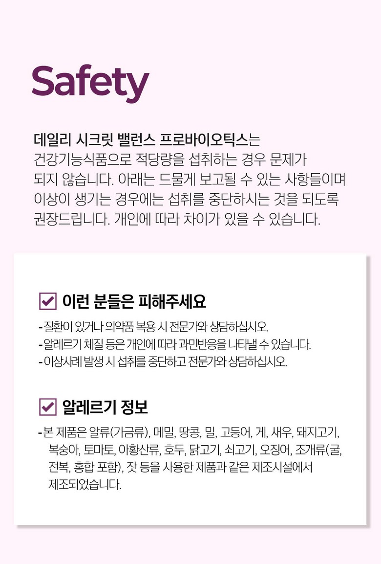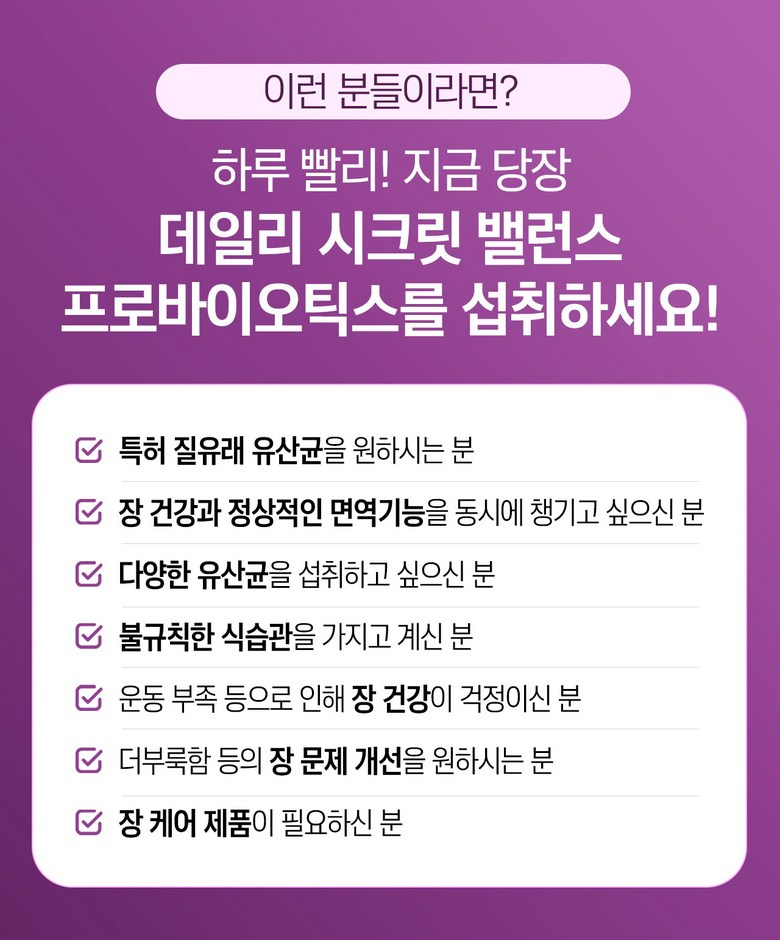 | 제품명 | 데일리 시크릿 밸런스 프로바이오틱스 | 제조업소의 명칭과 소재지 | 우리바이오㈜ / 경기도 안산시 단원구 성곡로 79 (성곡동) |