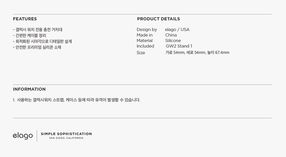 | 품명 및 모델명 | 엘라고 스마트워치 갤럭시 워치 충전거치대 GW2 | 인증/허가 사항 | 해당없음 |
