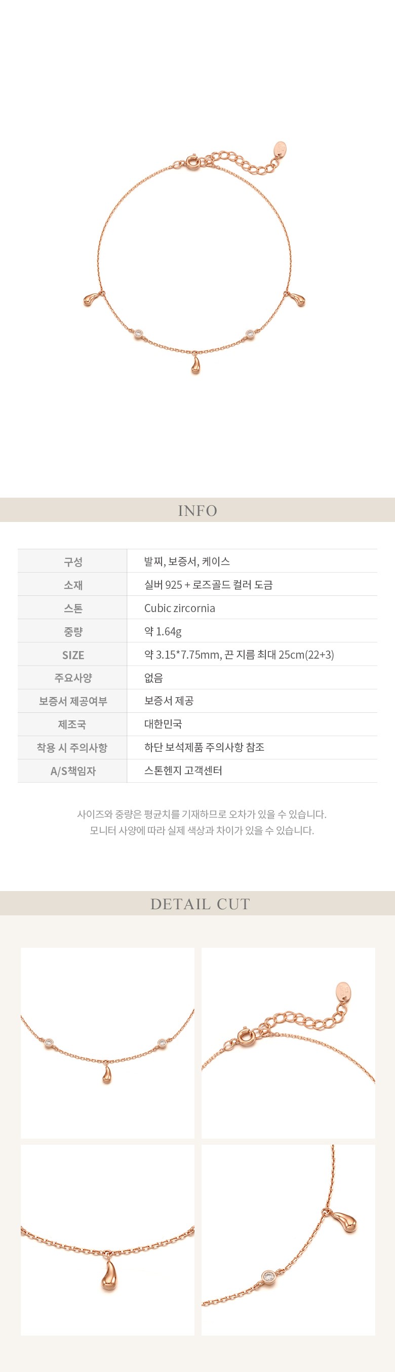| 치수 | 컨텐츠 참조 | 착용 시 주의사항 | 착용 후 화장품, 땀, 습기, 지문 등의 이물질이 없도록 닦아서 폴리 백에 보관하시면 변색을 최소화할 수 있습니다. 온도가 높은 곳(사우나, 온천탕, 찜질방 등)이나 반대로 온도가 낮은 곳은 피해 주시길 바랍니다. 소재에 따라 습기, 마찰 등에 의해 색이 빠지거나 변색될 수 있으므로 보관에 주의해 주십시오. 향수 또는 스프레이 사용 시 주얼리에 닿지 않게 주의하여 주십시오. |