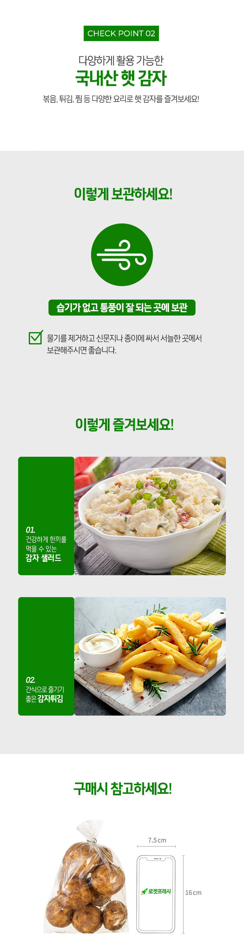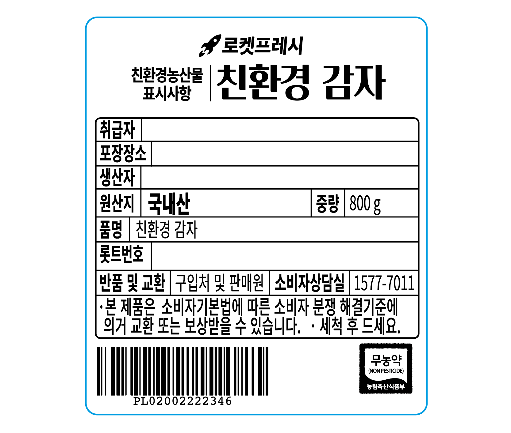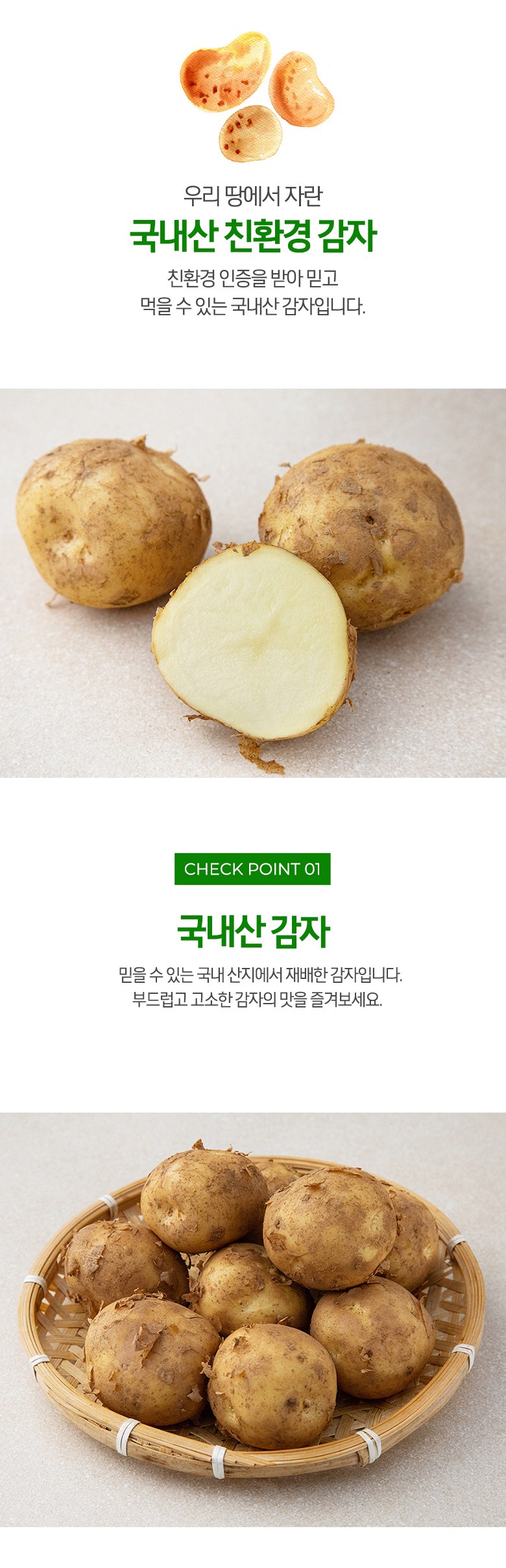 | 품목 또는 명칭 | 친환경 감자 | 포장단위별 내용물의 용량(중량),수량,크기 | 800gx3개 |