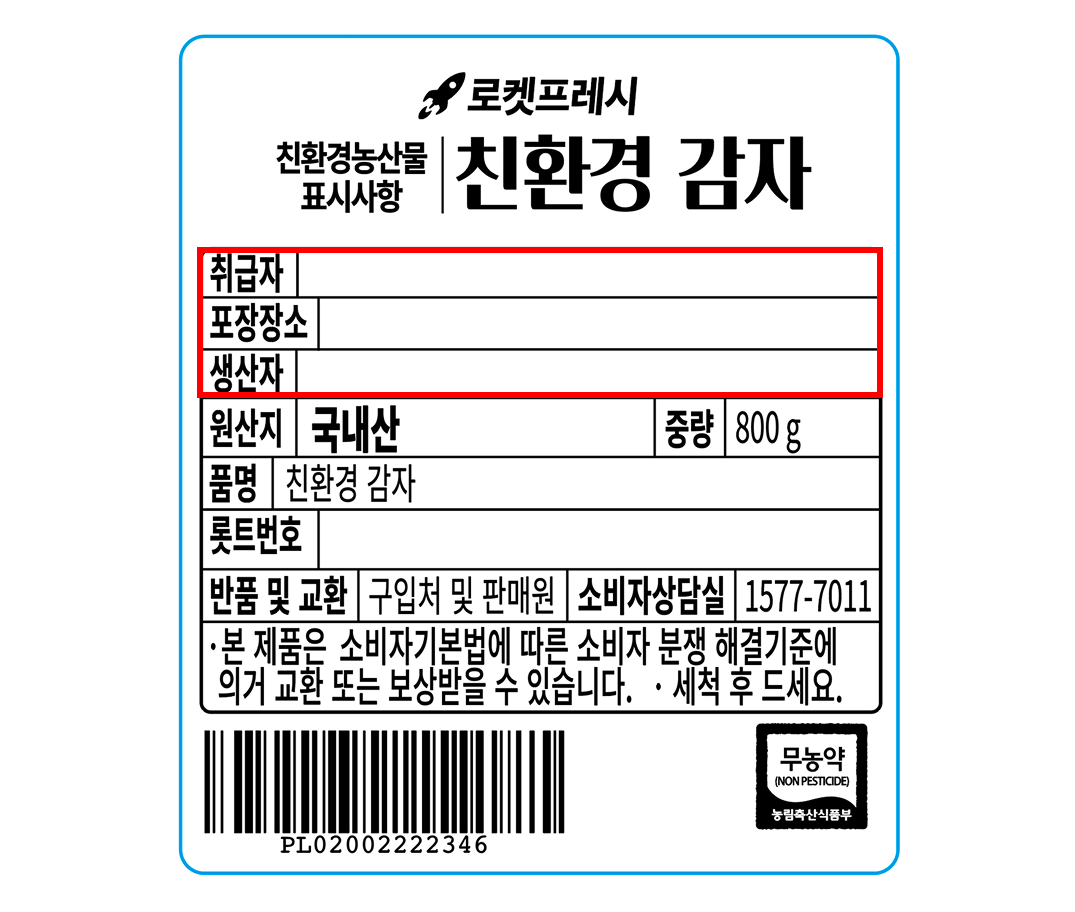 | 품목 또는 명칭 | 친환경 감자 | 포장단위별 내용물의 용량(중량),수량,크기 | 800g x 3개 |
