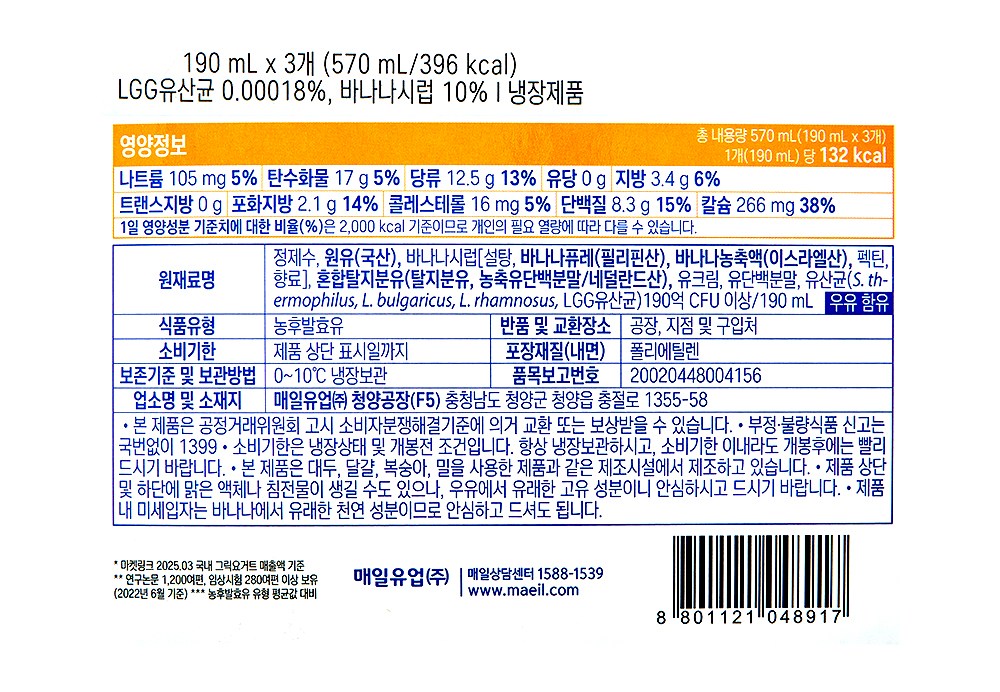 유제품 전문 브랜드, 매일유업이 선보이는 그릭요거트 드링크 바나나예요. 원유와 유크림을 사용해 고소한 풍미를 자랑하는데요. 여기에 바나나시럽을 더해, 기분 좋게 감도는 은은한 단맛을 완성했죠. 락토프리 요거트라, 평소 유제품이 부담스러우셨던 분들도 편안하게 드실 수 있답니다. 마시기 좋을 정도로 묽은 제형이니 샐러드 드레싱으로 활용하셔도 좋아요.
