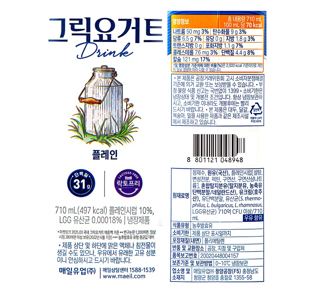 | 제품명 | 바이오 PROBIOTIC 그릭요거트 Drink 플레인 | 식품의 유형 | 컨텐츠 참조 |