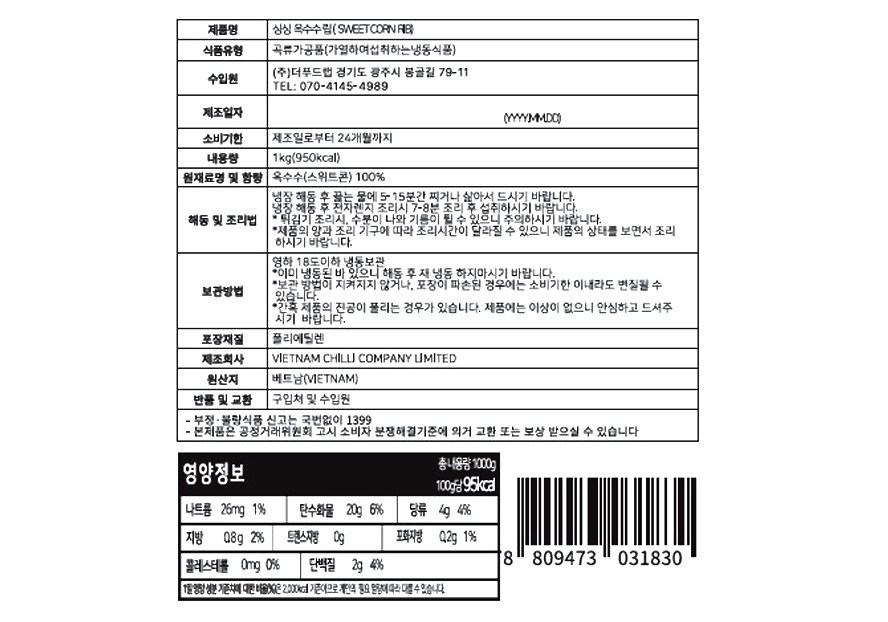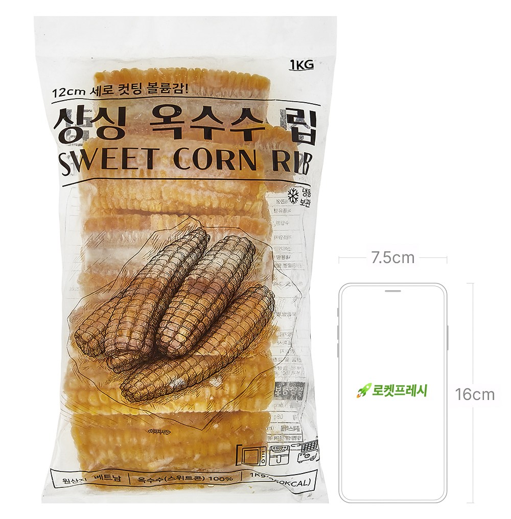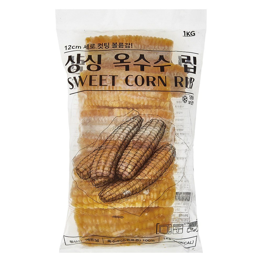 뼈 고기처럼 손에 들고 알알이 뜯어먹기 좋은 싱싱 옥수수 립이에요. 옥수수의 고소하고 달짝지근한 풍미가 그대로 담겼죠. 해동 후 그대로 삶아 부드럽게 톡톡 터지는 식감을 즐겨보세요. 먹기 좋은 크기로 손질되어 버터구이나, 샐러드 토핑으로 간편하게 활용하기 좋아요.