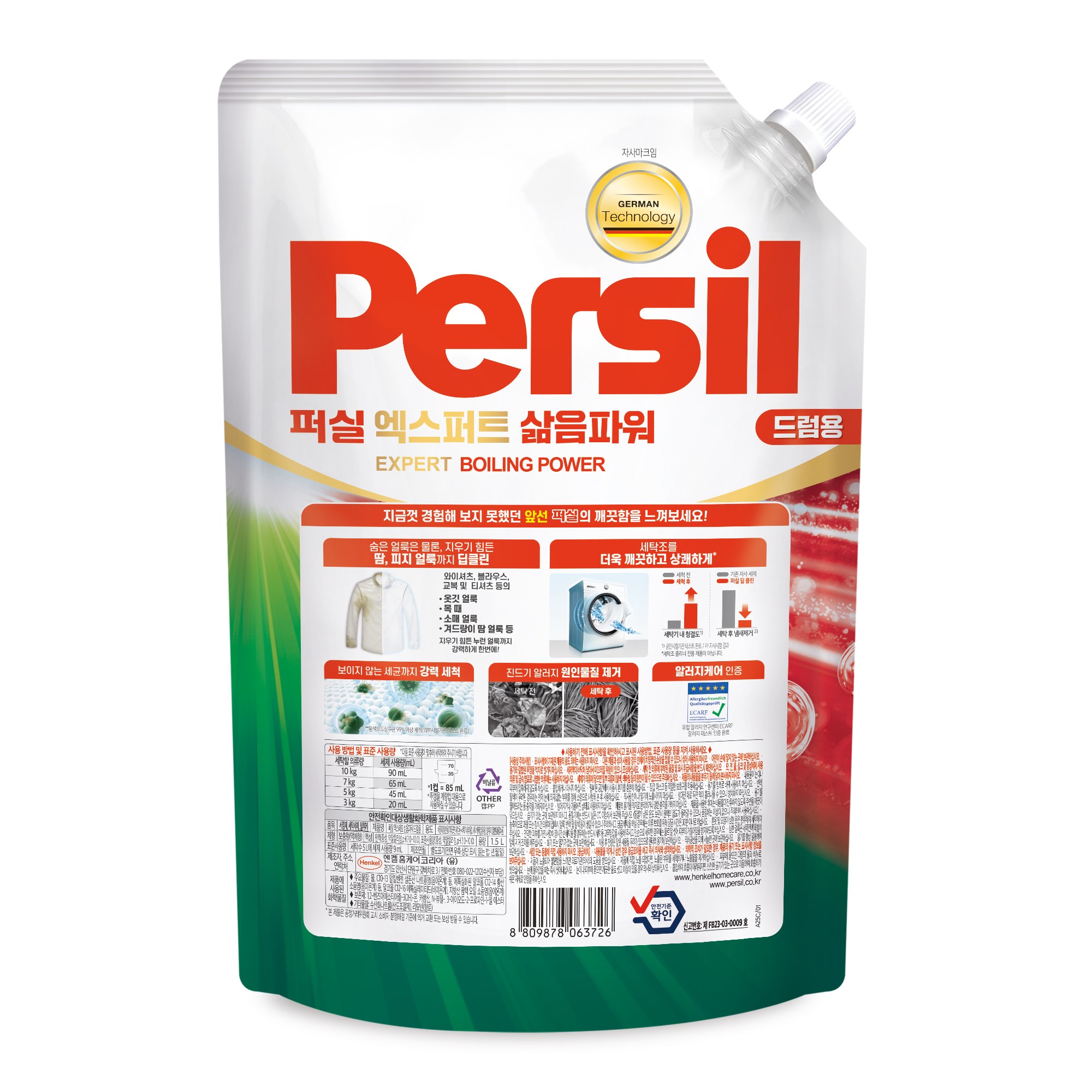| 품목 및 제품명 | 탈취제, 세정제, 세탁세제 / 퍼실 엑스퍼트 삶음파워 드럼용 | 용도(표백제의 경우 계열을 함께표시) 및 제형 | 일반용 (물체용), 일반용 (기타표면세정용 (세탁기내부용)), 섬유용 / 보충형(액체형) |