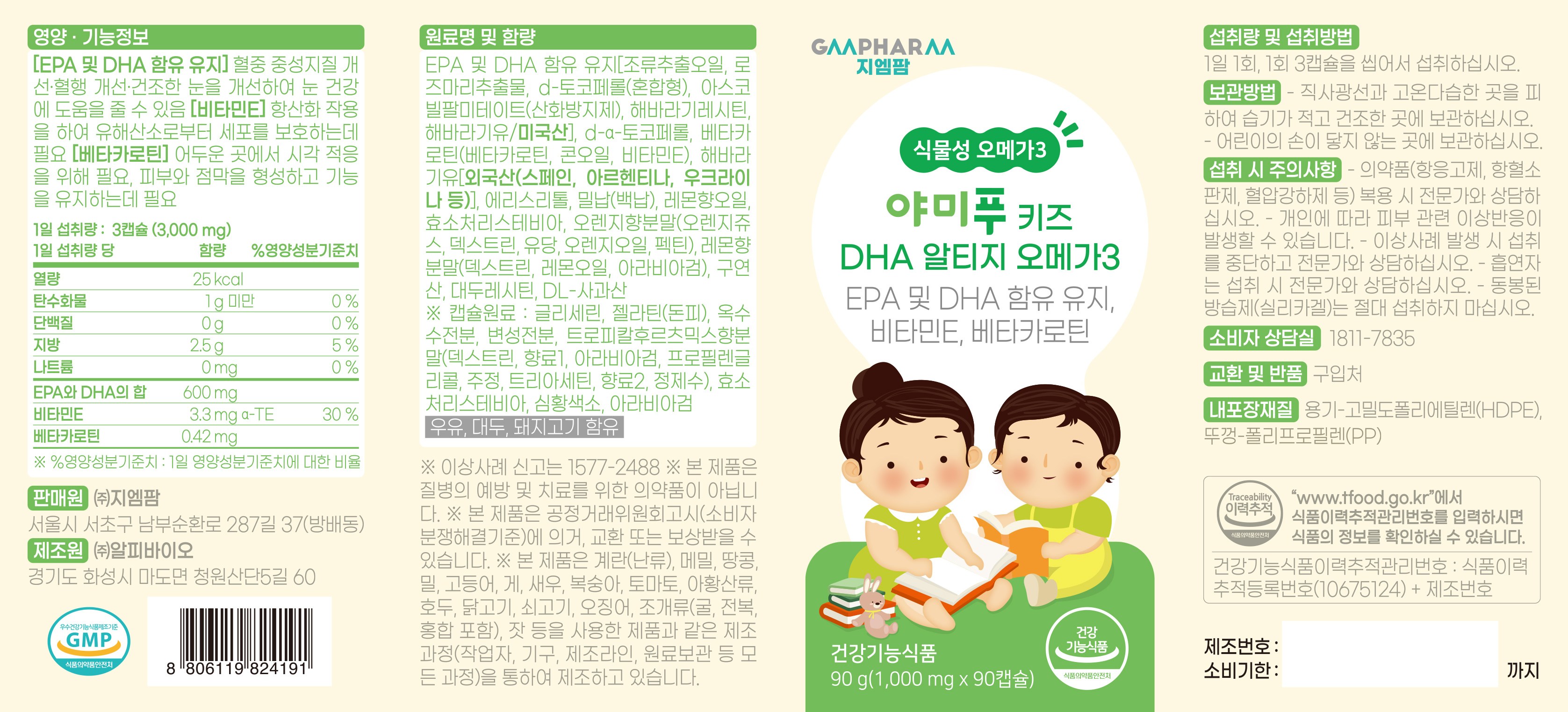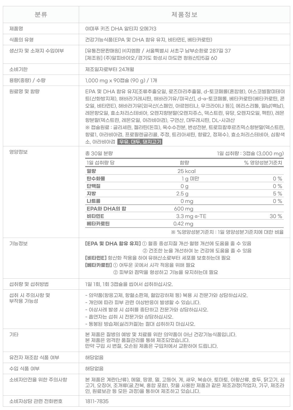 | 소비기한 및 보관방법 | 소비기한(또는 유통기한) : 2027년 03월 07일 이거나 그 이후인 상품 제조년월일 : 2025년 03월 07일 이후인 제조상품 보관방법: 컨텐츠 참조 | 포장단위별 내용물의 용량(중량), 수량 | 90g(1,000mg x 90캡슐), 3개 |