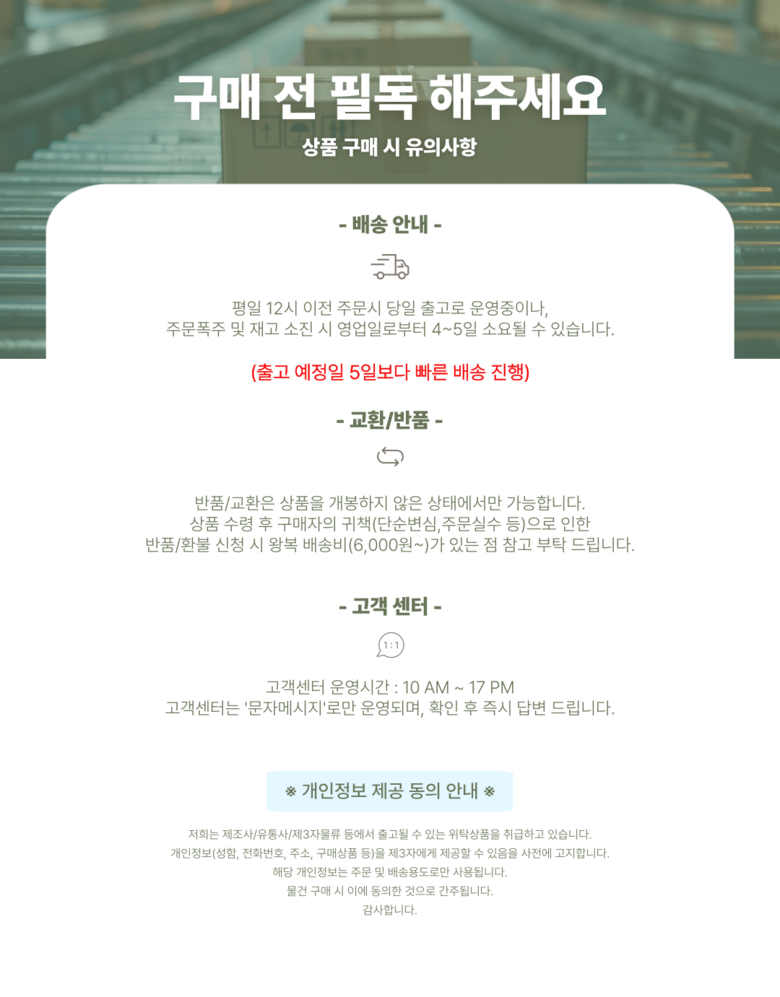 | 교환/반품 비용 (왕복비용) | 8,000원 - 단, 고객 변심의 경우에만 발생 - 도서산간 지역 배송불가 |