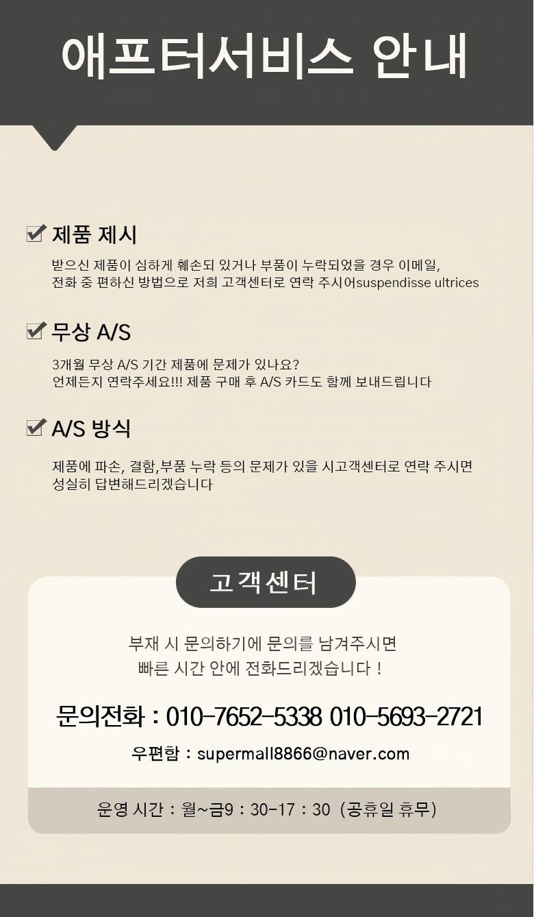 | 소비자상담 관련 전화번호 | 만약 받은 제품에 결함, 부품 누락 또는 조립상의 문제가 있다면매장, 이메일, 문자메시지로 문의 또는 전화주시기 바랍니다.고객복 전화:010-7652-5338/010-5693-2721상담 메일:supermall8866@naver.com | ||